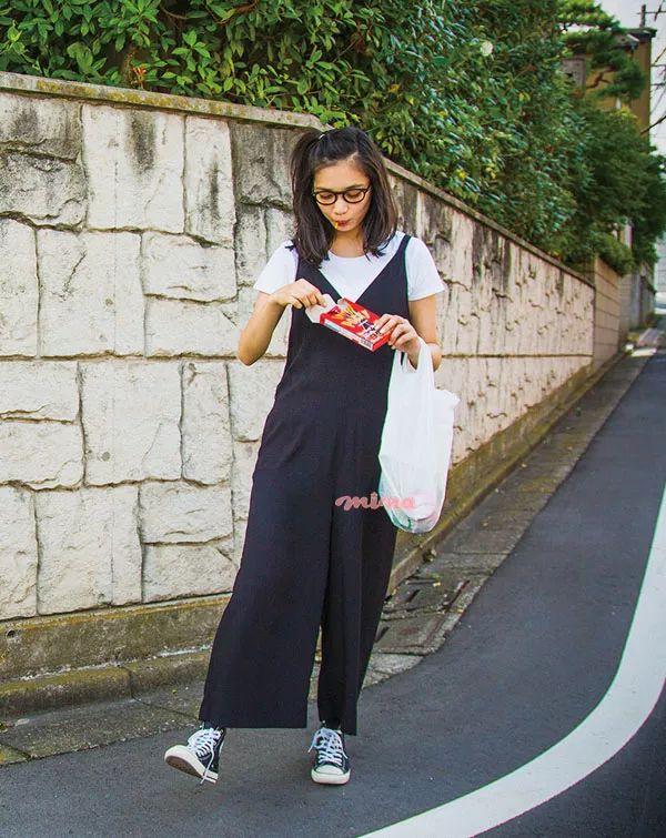 只是出门买点东西,直接穿上连体裤更方便。随意扎起的丸子头显得整个人可爱。