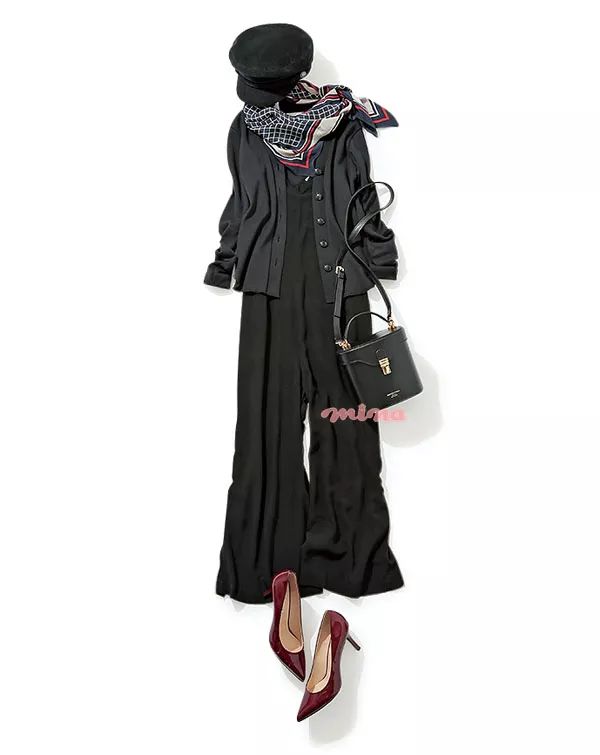 暗色系造型搭配华丽印花丝巾,优雅可爱。