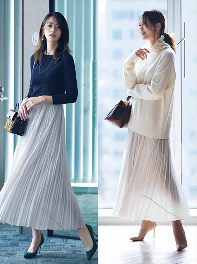 中长款的半身裙还是比较有利于修饰身材的,只需要搭配的时候露出你的脚踝,就很容易修饰身材了,不会觉得厚重。再结合高跟鞋搭配,真的太精致了,想要成为女神就这样搭配吧。
