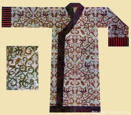 贵族穿的曲裾深衣则是垂胡式的长袖长裾深衣,这在长沙马王堆汉墓的一幅帛画中可以看到,墓主人身穿一件宽松肥大的深衣,上面绣满了美丽繁复的花纹,衣裾宽大,衣袖也是的“垂胡”式样。