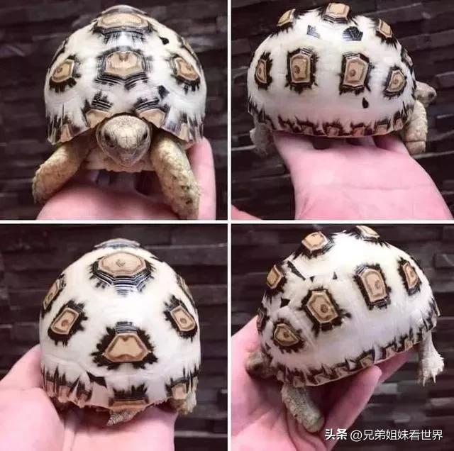 一只白豹龟。原产于非洲南部地区,现已广泛引种至世界各地,喜欢栖息在半干燥带荆棘的草原上,炎热的季节会夏眠,寒冷的季节会冬眠。