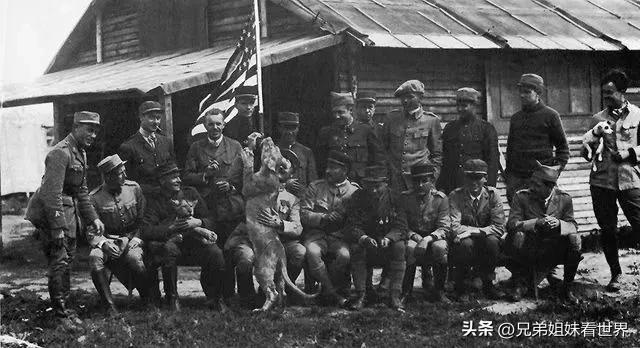 美国飞行员与他们的幼狮吉祥物威士忌。后排左起第四位,头戴贝雷帽的尤金·布拉德是美国历史上第一位非裔飞行员。