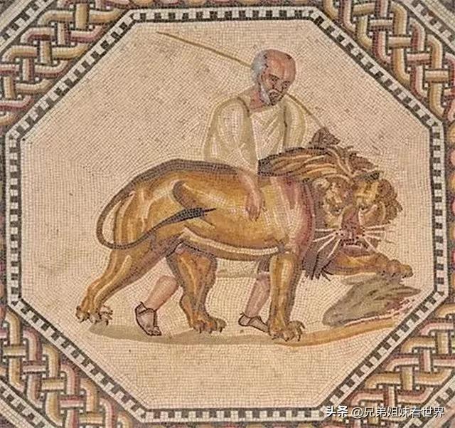 罗马马赛克,描绘了一个可能是狮子守护者的人。如今这个马赛克装饰着德国西南部的一座罗马别墅。