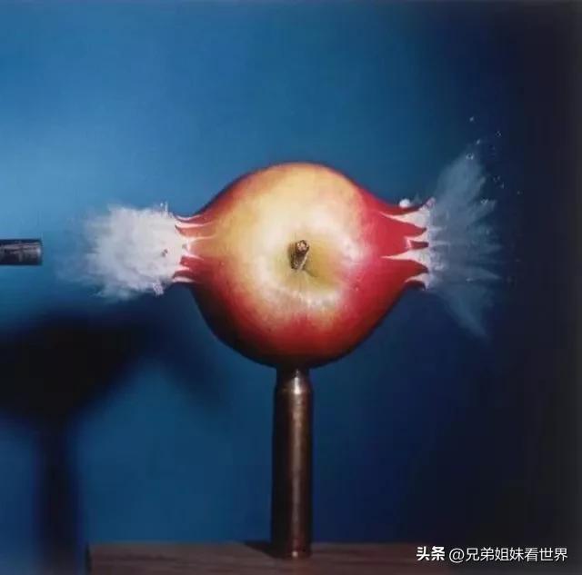 1964 年,麻省理工学院教授哈罗德“博士”埃杰顿于 拍摄了这张照片,显示了一颗0 .30 口径的子弹正穿过一个苹果。