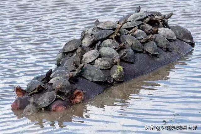 由于附近没有岩石或原木,30只海龟选择在这只河马身上休息。也许在它们眼里,河马就是一块大岩石。