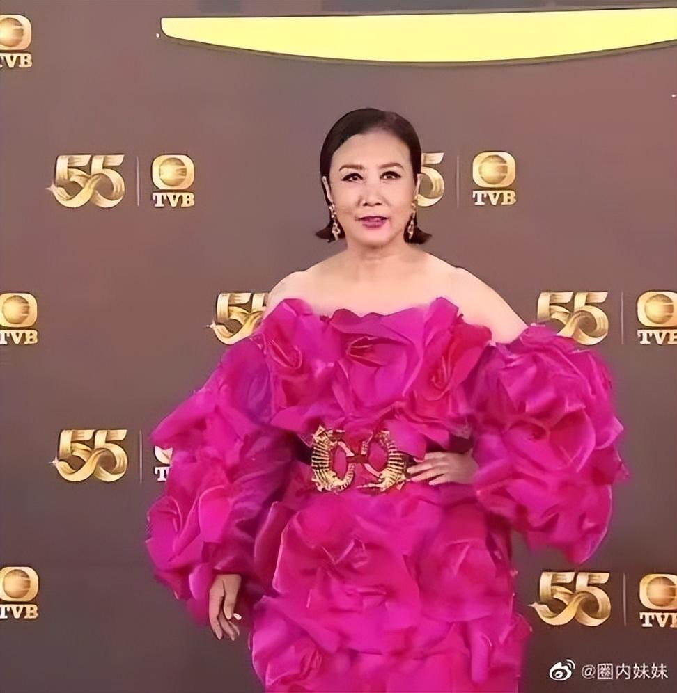 TVB55周年台庆时,她就穿着玫瑰色裙子、玫瑰色高跟鞋,大大方方做艳丽的那一个。