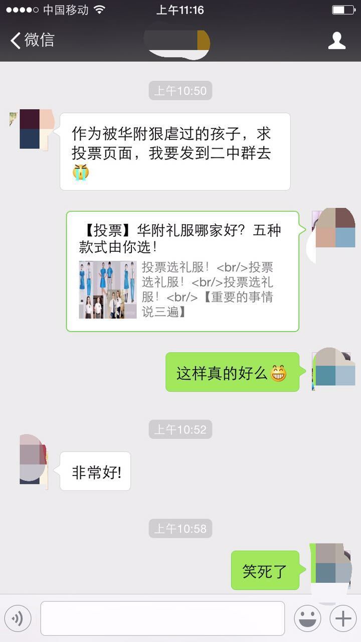然而,到了晚上,事情悄悄起了变化,“第三款优卡(北京)蓝灰系列”后来居上。原来,华附征集礼服方案一事在微信朋友圈经过多轮转发后,广州各大中学的学生及校友也加入了投票的行列中。同时,为了表达对广东第一牛校的“敬意”,他们纷纷将票投给了自己认为“颜值”较低的蓝灰系列。短短七分钟内,蓝灰系列就从969票被刷到了1192票。到昨晚11:20分,票数直接窜至3739票,已经比第一款伊顿格子系列高出了2400多票。众多友校学子表示此举是为了感谢当年“四校联考”华附辛苦出题虐学渣。意识到形势严峻后,华附人也开始了“刷票护校”行动,死守1号。同时、佛山、深圳、中山、甚至北京的网友也加入了“挺3”行列。投票将持续至7月18日。