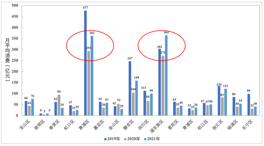 《报告》指出,三年新冠疫情的前中后对居民消费类型占比和分布格局影响不大。2021年,上海大部分地区月均消费水平出现显著增长,黄浦区和浦东新区仍居于高位。其中,浦东新区21年月均消费额增量,甚至超过疫情前。