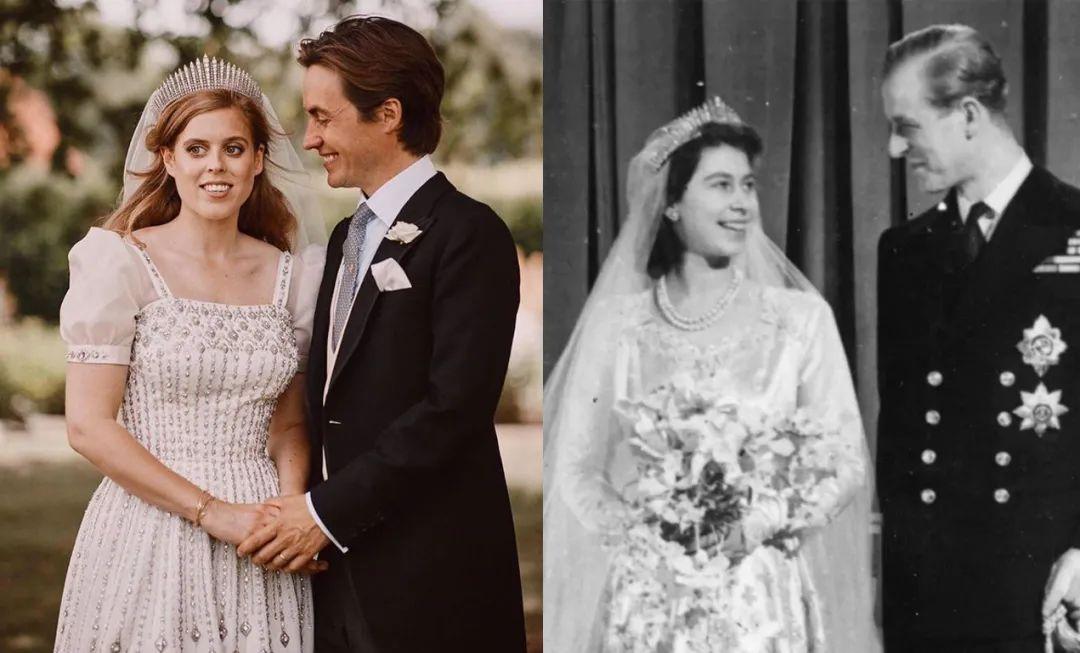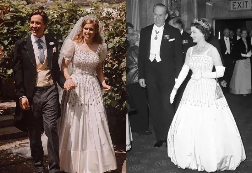 也有一些人的婚纱,走的朴素路线。碧翠丝公主穿的礼服风格朴素,但很有讲究。这套象牙色礼服当年是由女王婚纱的设计师Norman Hartnell设计,婚礼时为了借给公主,女王造型师Angela Kelly还亲自进行了改造。