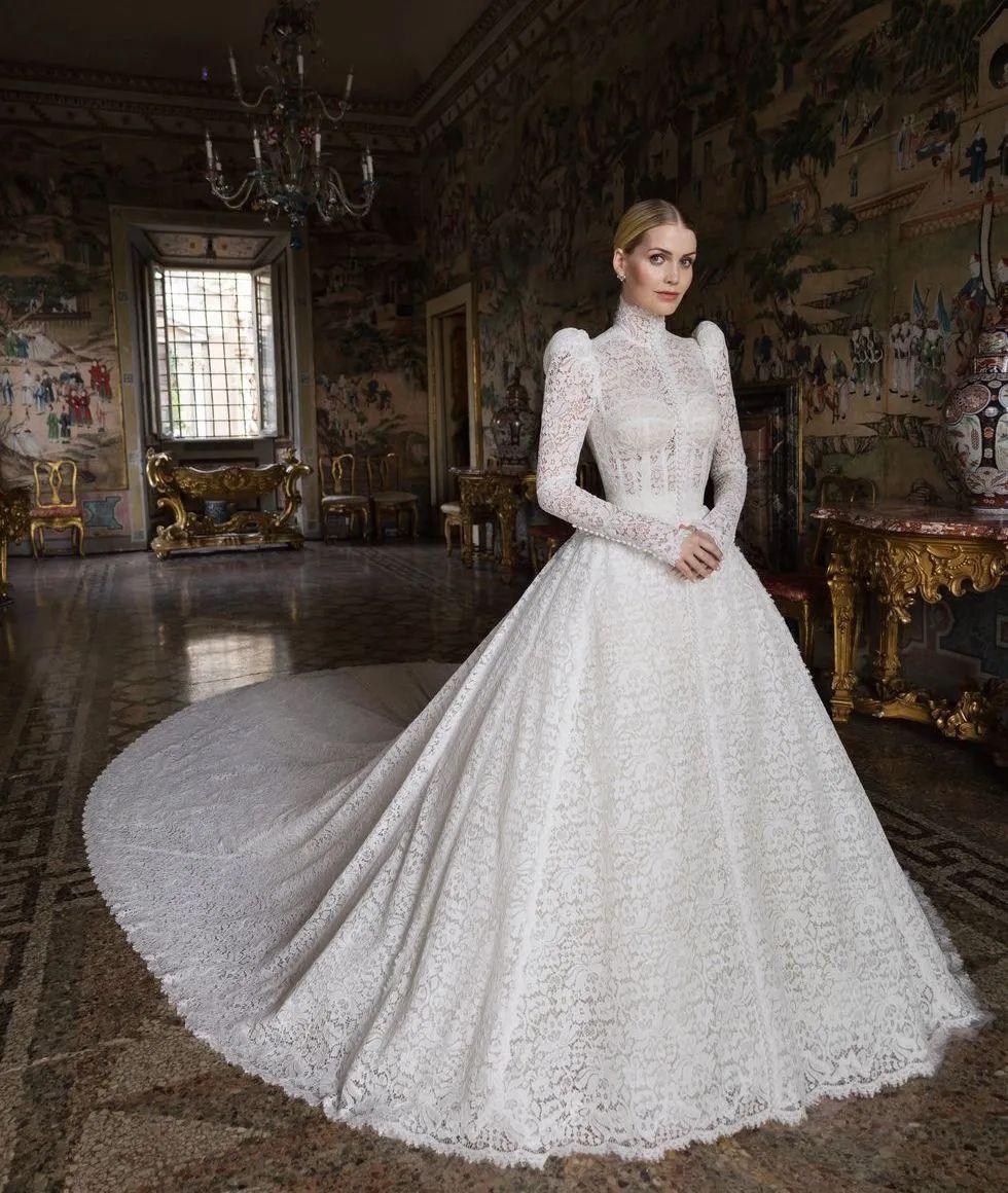 Kitty Spencer结婚时的婚纱也让人印象深刻,是一件长袖带垫肩的款式,还是高领设计、很凸显气场,有种女王范。