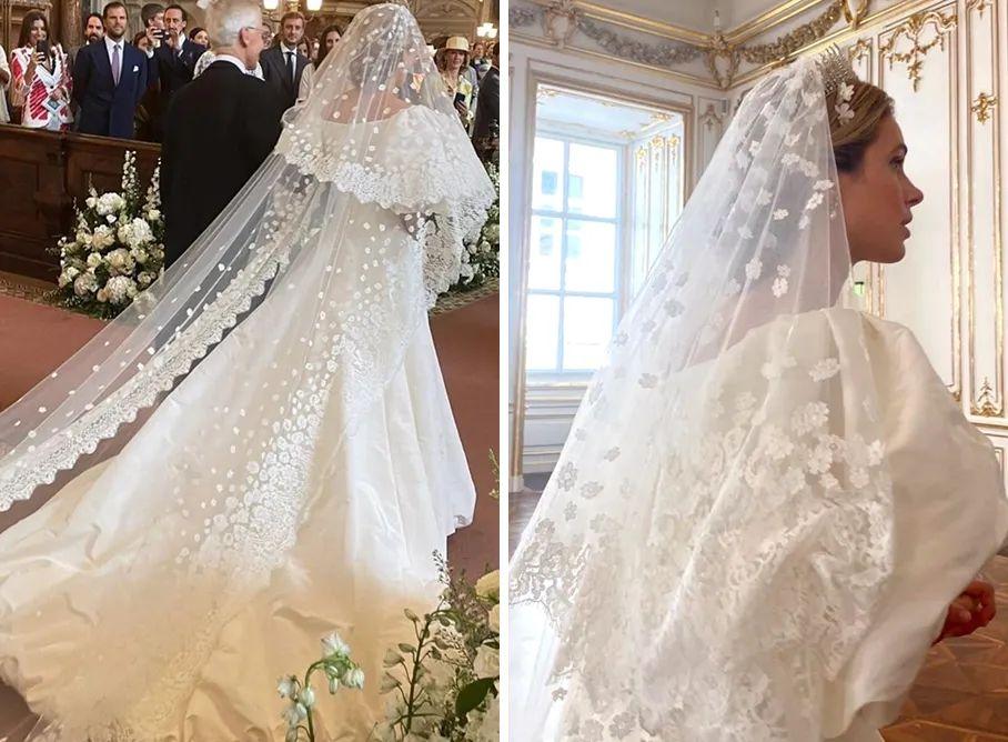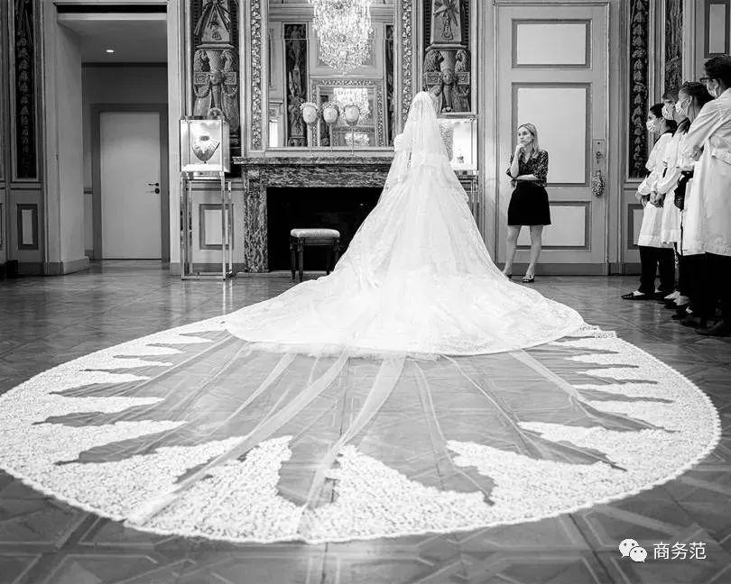 婚纱的拖尾长,还绣了皇室徽章。