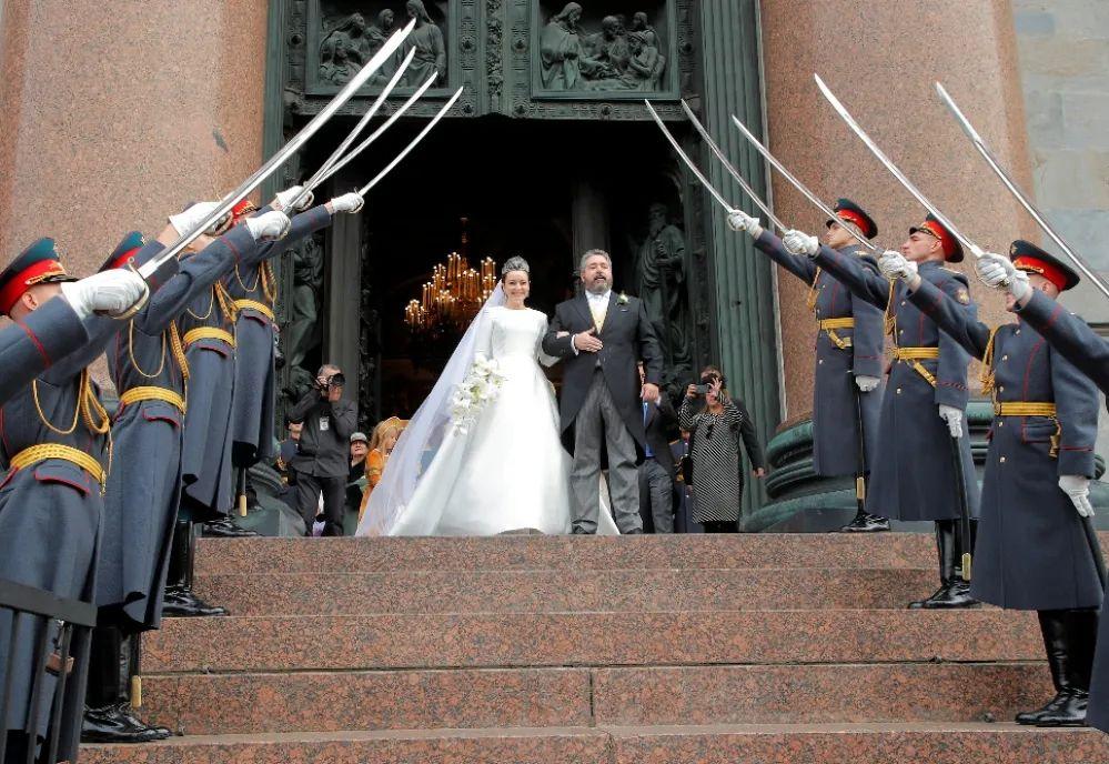 这场婚礼的主角是40岁的新郎乔治·米哈伊洛维奇·罗曼诺夫,是沙俄罗曼诺夫王朝的后裔。出生在马德里,2019年的时候才搬到俄罗斯。