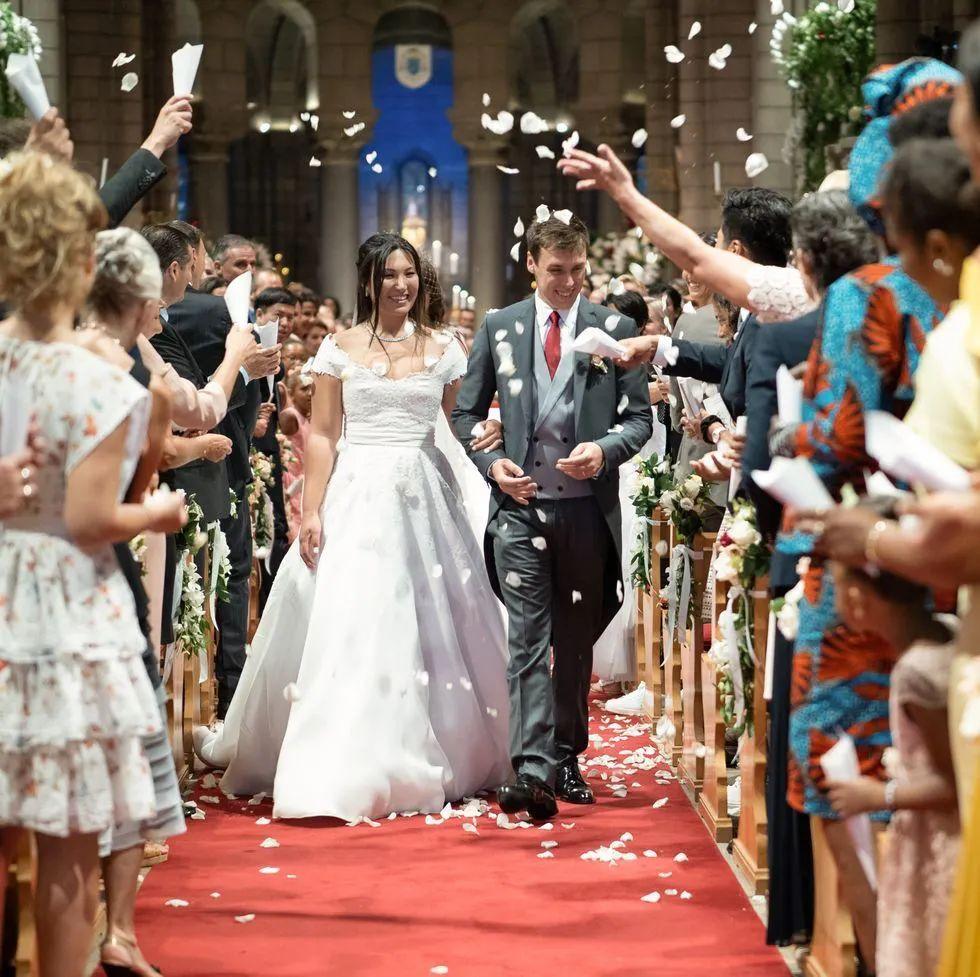 摩纳哥王室一般也选择教堂作为婚礼地点。比如格蕾丝·凯莉的外孙路易和妻子Marie,之前就在摩纳哥大教堂办了一场规模更大的仪式,教堂内布置着白色鲜花,神圣又浪漫。