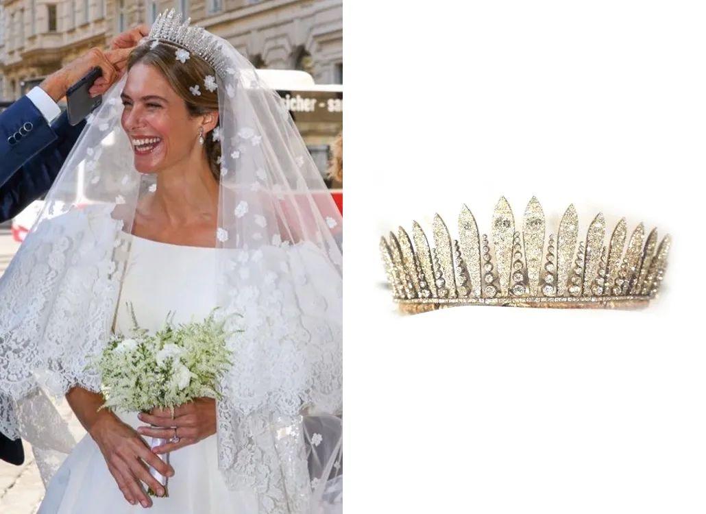Maria公主在婚礼上佩戴的冠冕也很有来头,是列支敦士登的的哈布斯堡尖顶王冠,比碧翠丝公主戴的冠冕历史还要久。