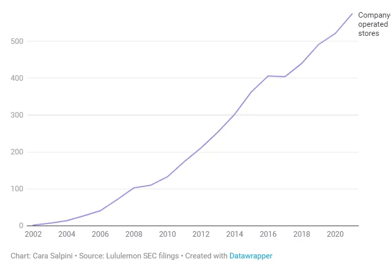 店铺量自2008年以来增长了五倍Lululemon从2002年到2021年的店铺量。