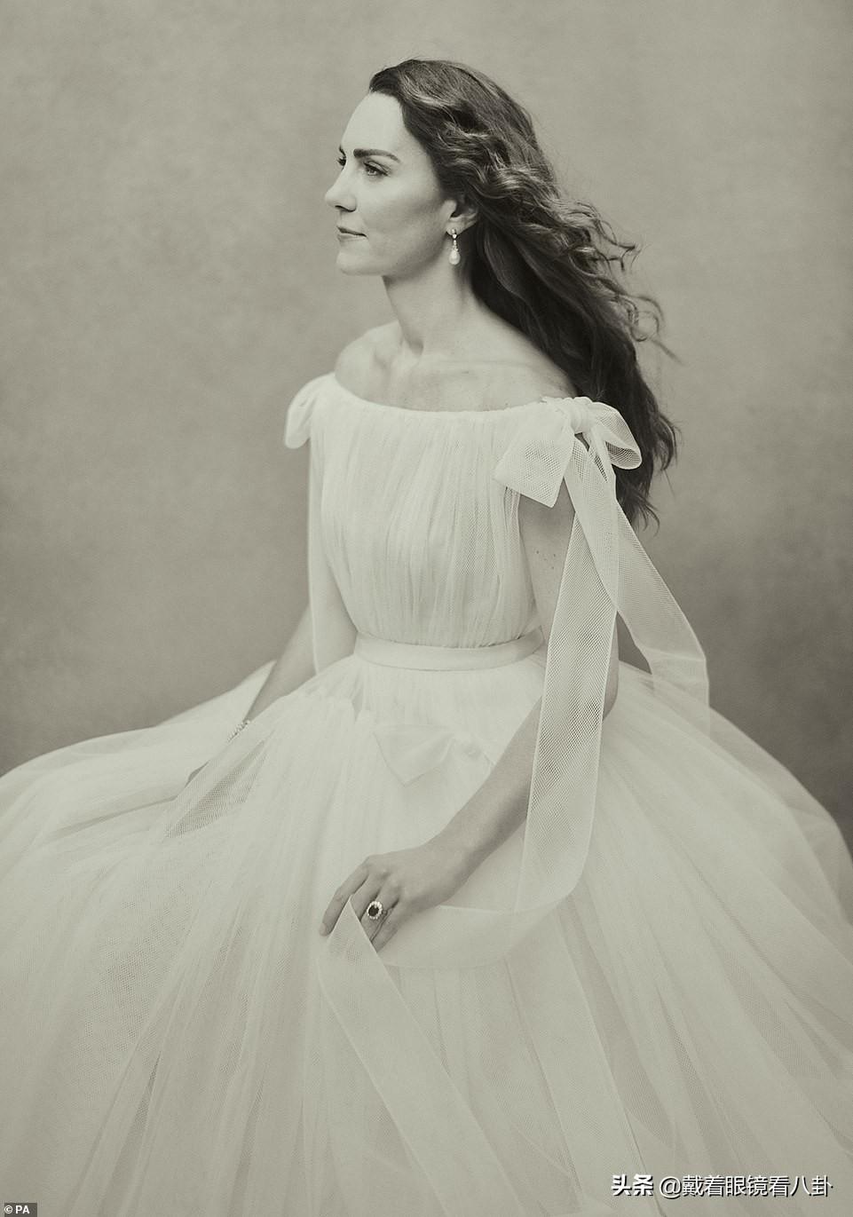 在另一张黑白照片中,凯特穿一件露肩蓬蓬纱裙眺望远方,耳朵上戴的是戴安娜王妃的柯林伍德珍珠和钻石耳环,手上戴的蓝宝石戒指也属于戴安娜王妃。