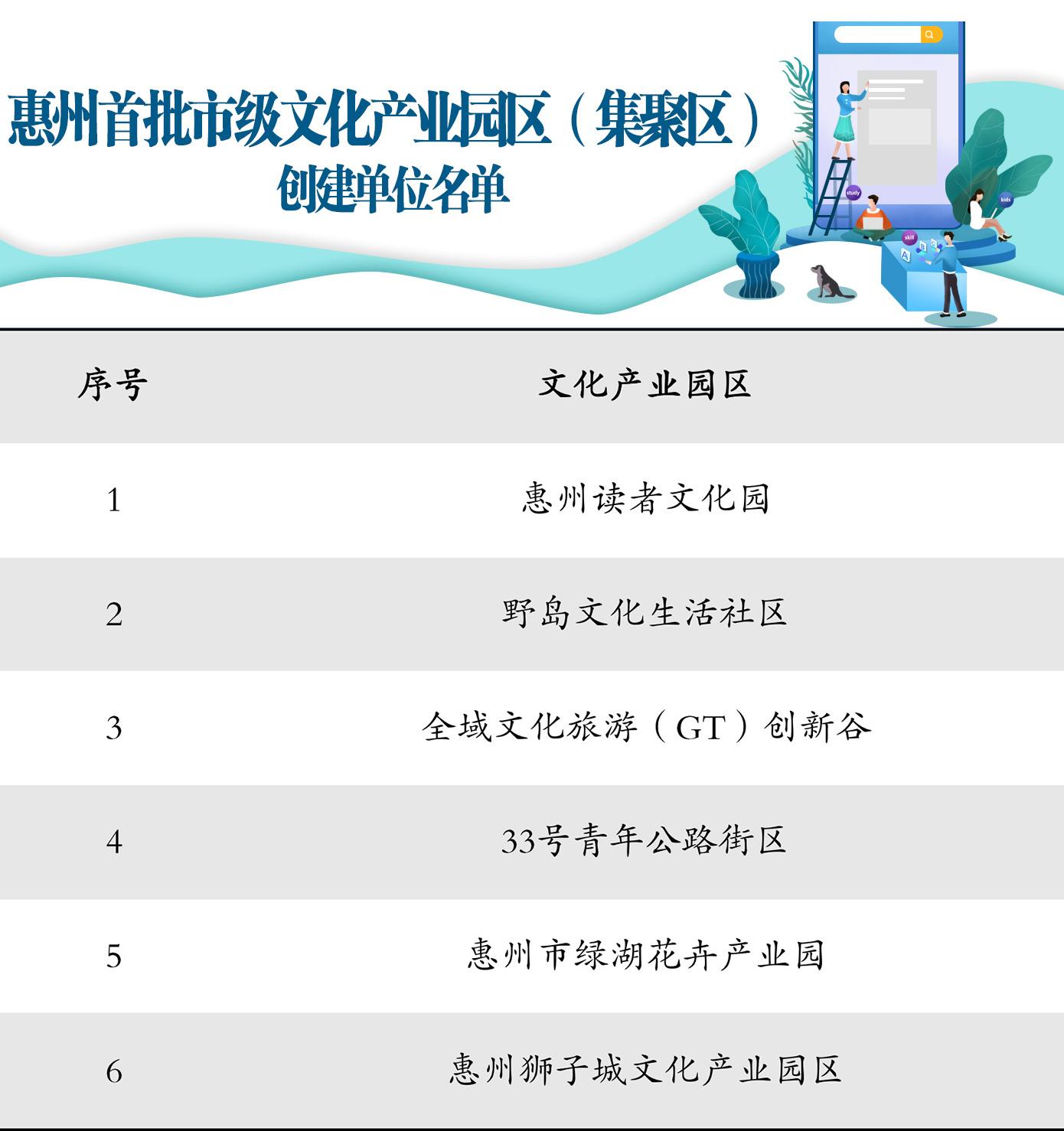 为推动惠州文化产业高质量发展,进一步引导全市文化产业更具规模化集聚化,根据《广东省文化厅省级文化产业园区管理办法》,惠州市文化广电旅游体育局将读者文化园、野岛文化生活社区、全域文化旅游GT创新谷、33号青年公路街区、绿湖花卉产业园、狮子城文化产业园区6家园区,确定为惠州首批市级文化产业园区创建单位。