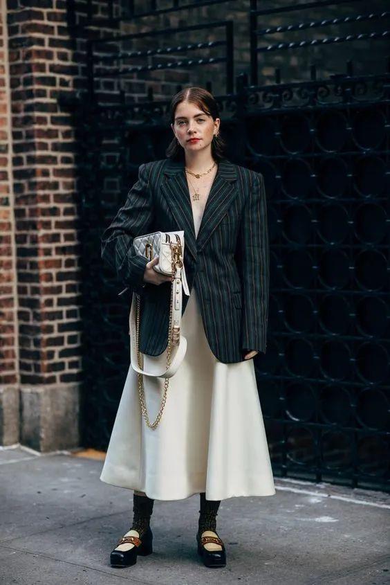 除了简约、古典的倾向性之外,通勤风还变得更有日常感。将牛仔裤与朴素风格的正装搭配,是一种很时髦的组合。