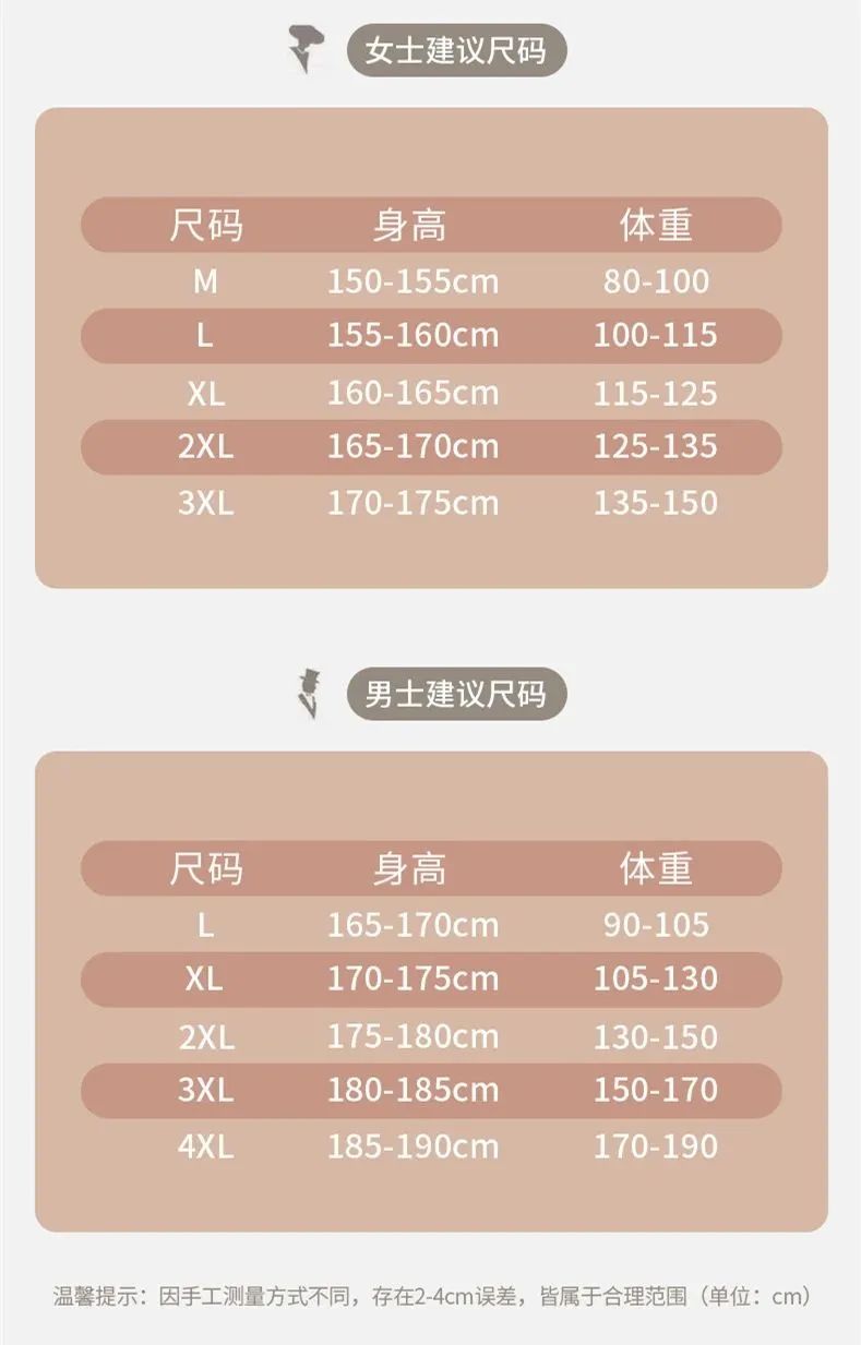 女款80~150斤可穿,男款90~190斤可穿,女款、男款具体尺码参考如下: