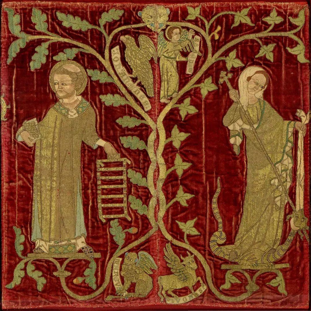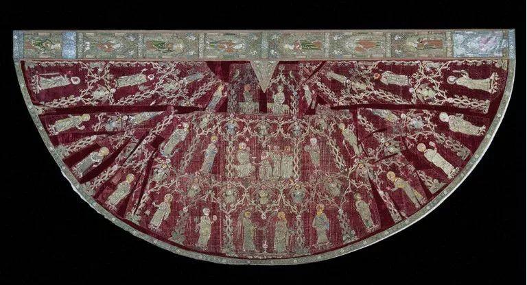 刺绣的历史虽长,但欧洲早年都以绣毯为主,到了中世纪才有图样绣衣的习俗。其中又以英国绣件受欢迎,时称OpusAnglicanum,是当年流行的外交礼品,通常以亚麻布为基底,上绣金银线图样,常被用来做教会神职人员的礼衣、挂饰、精装书封面等。