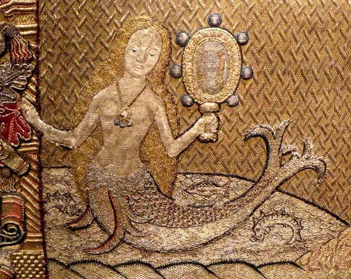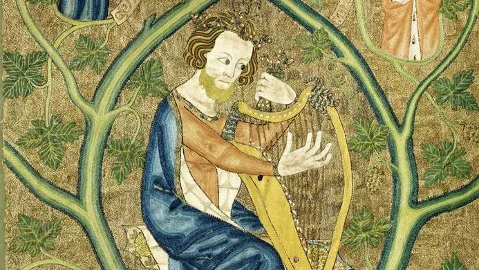 中世纪的刺绣图样以宗教议题为主,但因技法没有现在成熟,所以里面的人物看起来就像从卡通中走出来的。而为克服人像的崩坏,绣匠们用了声东击西的方法,也就是加强藤蔓、动物的细节,好把观赏者的目光从人像上引开。