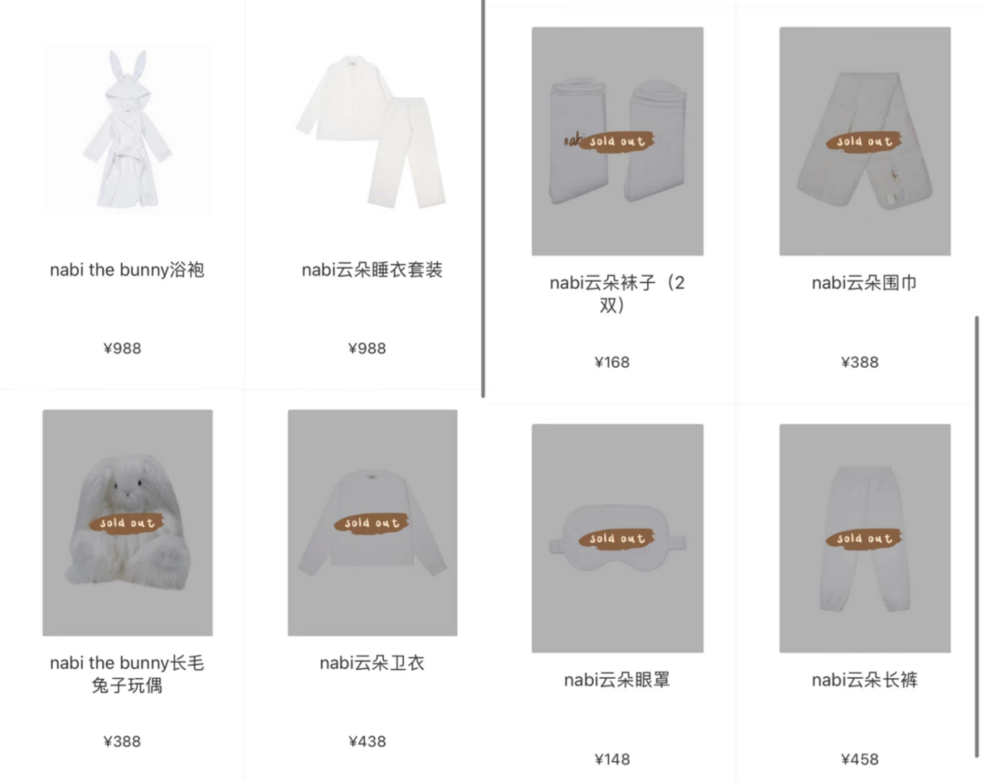 虽然高定价"击碎了nabi女孩的梦",但首轮发售的"云朵胶囊系列"8件单品中,除了贵的浴袍和睡衣套装,其余6件均已售罄,其中包括定价148元的纯白色混纺眼罩,以及168元(2双)的白色棉袜,而它们的共同之处在于,都打上了"nabi"的Logo。
