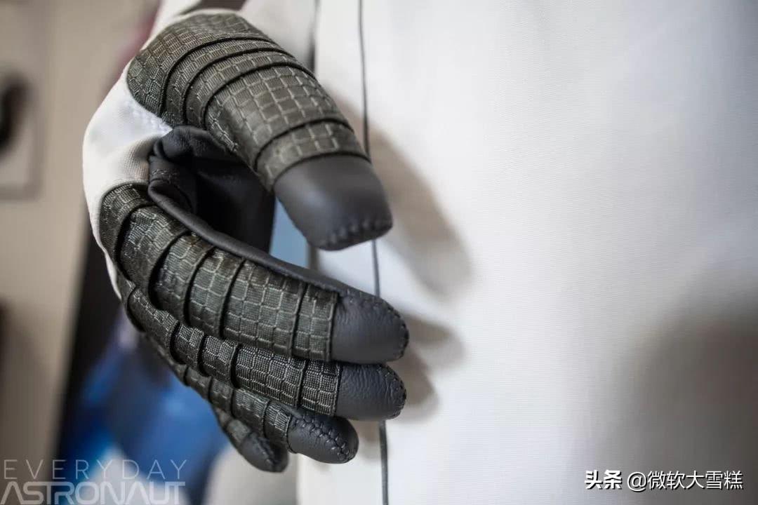 宇航服黑灰色材质,由一种名叫诺梅克斯的芳族聚酰胺纤维制成,高弹性、柔韧性表现极好,让宇航员行动灵活。