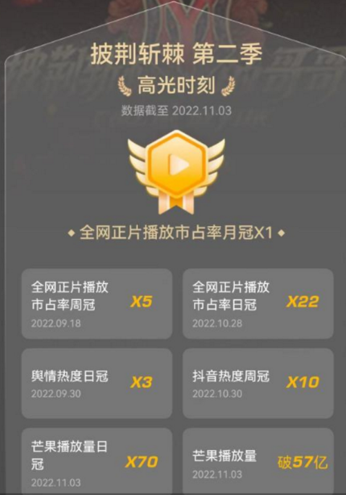 节目拿下10个抖音热度周冠,70个芒果播放日冠,22个全网播放市占率日冠。