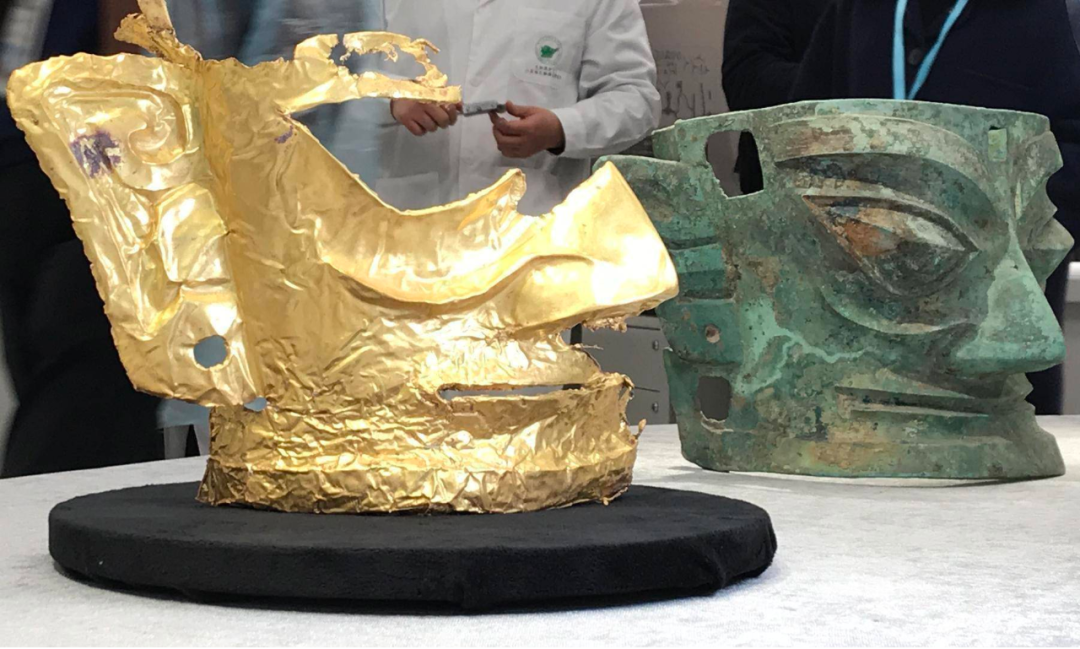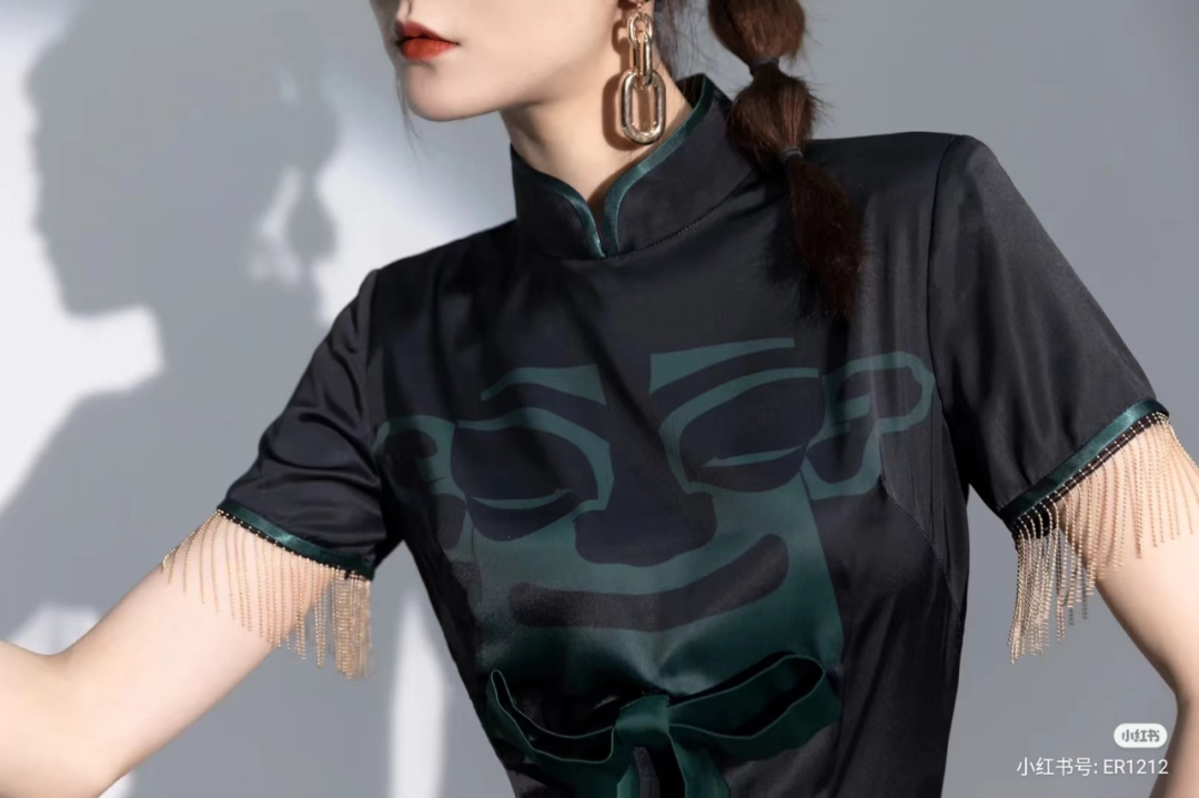 成都的奇妙之处又在于,几千年历史的DNA里一直就有“潮”。当三星堆文物刚刚出土,大家还在惊讶三千年前的黄金面具都有耳洞的时候,成都人就把它的好兄弟——旁边的青铜面具给印到了旗袍上,袖口的金色流苏则与黄金面具巧妙呼应。青铜面具和旗袍之间碰撞出复古+复古等于新潮的奇妙应。