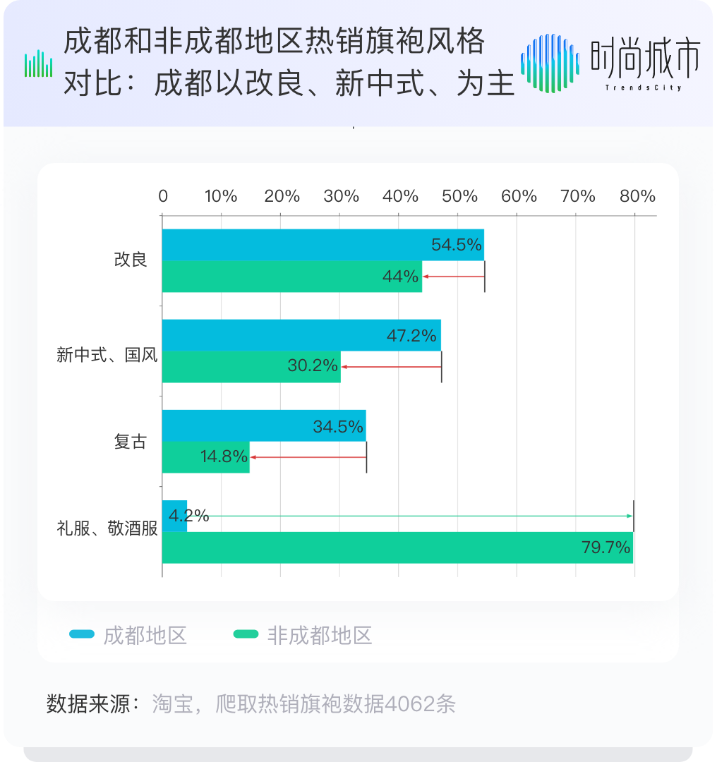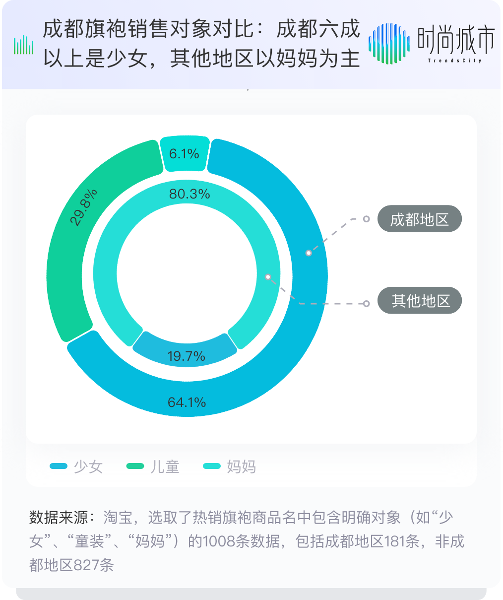 时尚城市研究院爬取的淘宝数据即显示,成都旗袍的销售对象,在成都六成以上是少女,其他地区则以妈妈为主,占比超过八成,而少女占比不足两成。