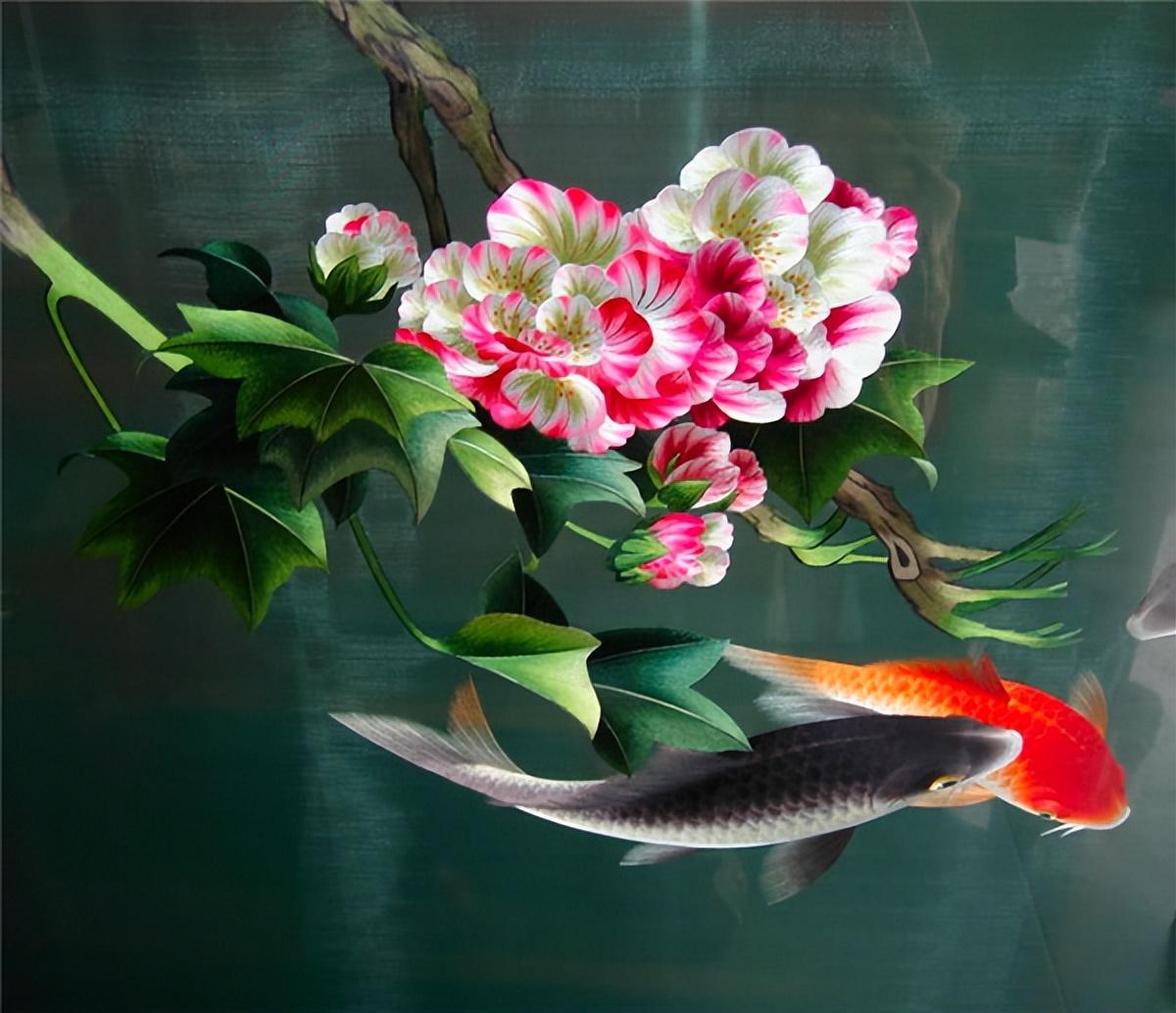 蜀绣针法数量居于四大名绣之首,共有12类,总计超120种针法,讲究“针脚整齐,线片光亮,紧密柔和,车拧到家”,其中“车”指绣品的点睛部位,自点睛处起“笔”,全凭绣工过往经验向四周扩绣,“以绣带笔”达到中国画浓淡写意的果;“拧”则恰好相反,是指运用晕针、铺针、滚针等针法,从绣品外围逐渐向内添针或减针,着力表现色彩的细微变化。其中芙蓉鲤鱼是蜀绣的代表性题材。