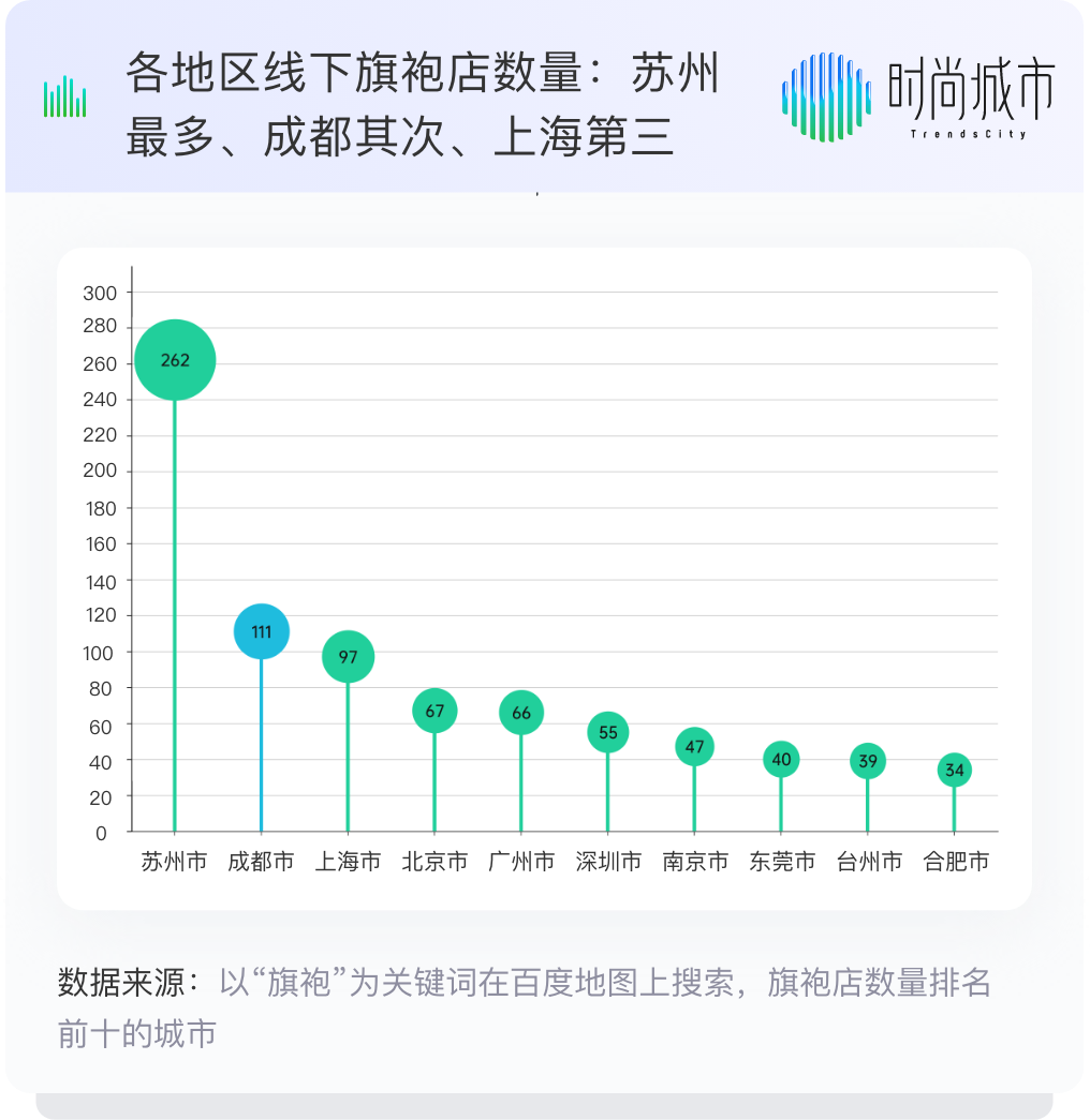 旗袍讲究量体裁衣,线上购物当然不够。时尚城市研究院以“旗袍”为关键词在百度地图上搜索发现,成都坐拥111家线下旗袍店,数量仅次于苏州。