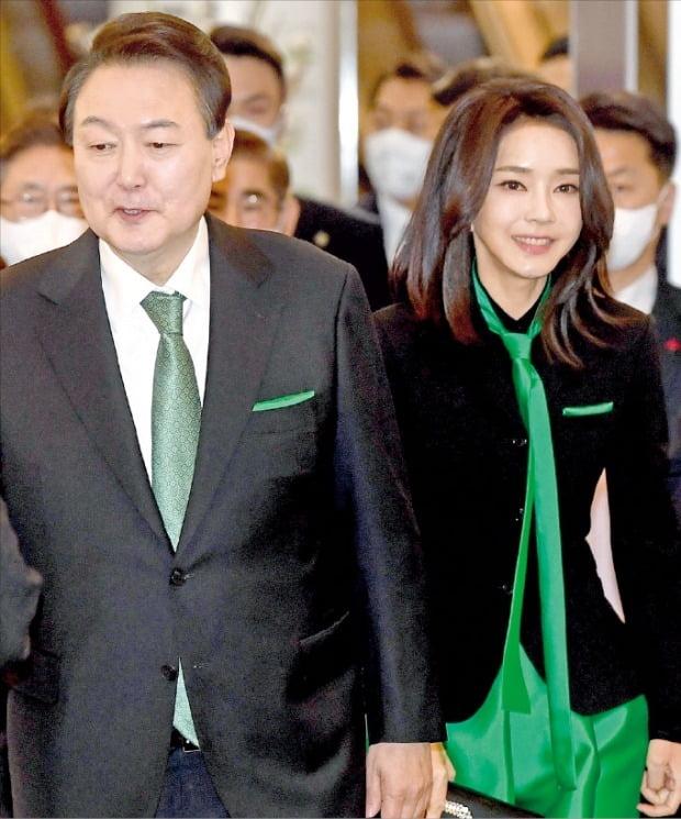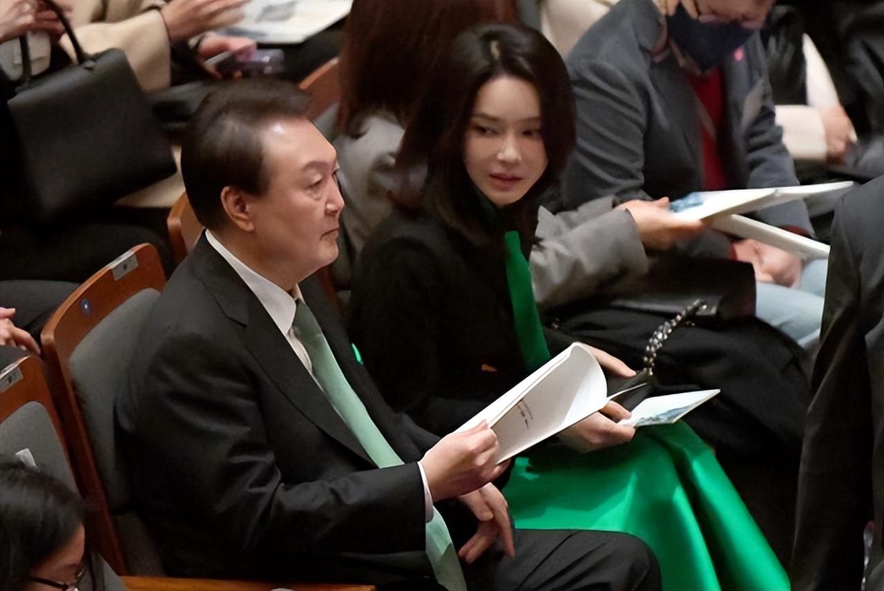 昨天,金建希穿的裙子,设计真的很特别,上面还有一条绿色的领带。她的丈夫尹锡悦也戴了绿色的领带,两人可是穿得情侣装出现的啊!