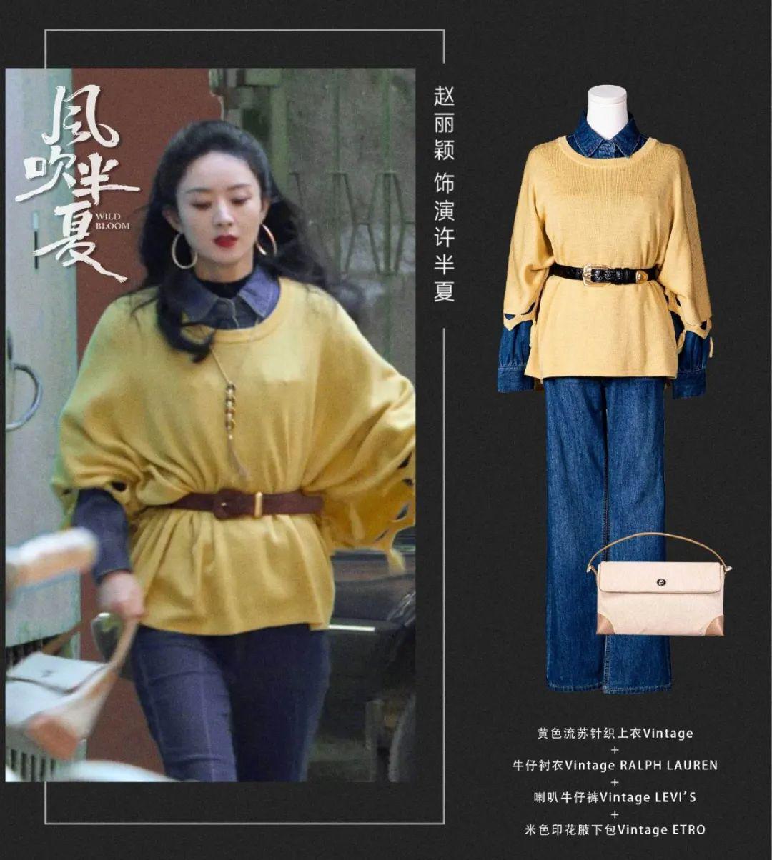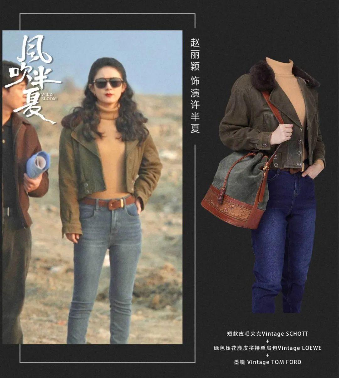 赵丽颖出场的第一套衣服,就是LEVI’S Vintage的牛仔衬衫,搭配NINA RICCI Vintage 黑西装,连墨镜也都是90年代的TOM FORD。
