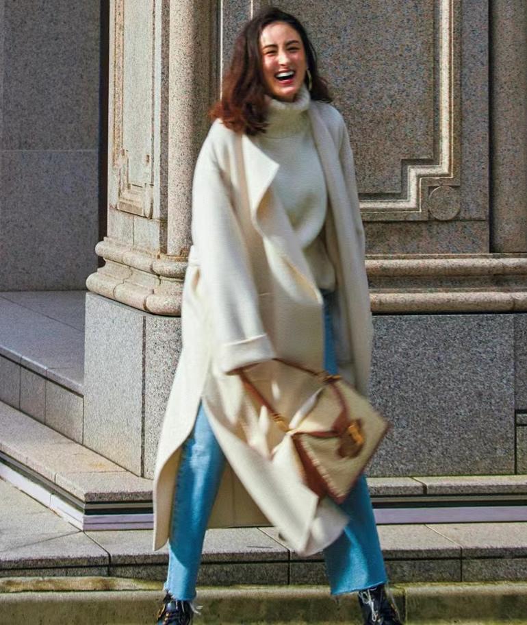 轻薄的米色羊绒大衣,淡雅色调的柔和弱化了翻领的存在感。比起利落而言,永远显得那么乖巧甜美。但就是这一点洒落与硬朗,于一身温柔中异常难得。