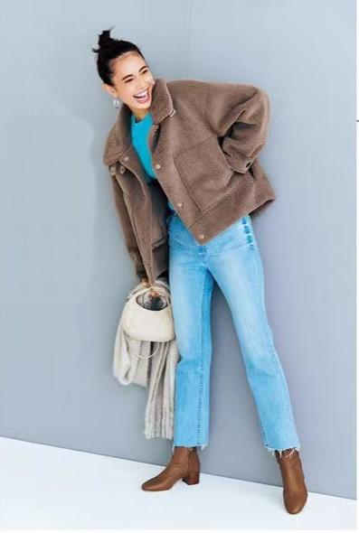 冬季女生面试服装搭配技巧二、毛绒外套+黑色打底衫+牛仔小脚裤