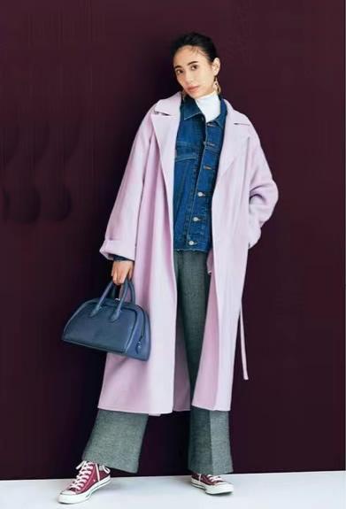搭配时,用牛仔衣与灰色直筒阔腿裤调和,混搭得风生水起。为了呼应粉色,来双红色帆布鞋吧。色调、风格全都滴水不漏。