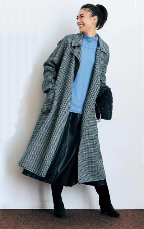 洒脱而立的H版型,特别适合敞开穿。内搭蓝色毛衣与皮裙,独属灰色调的清冷酷意,就是一抹知性风景。