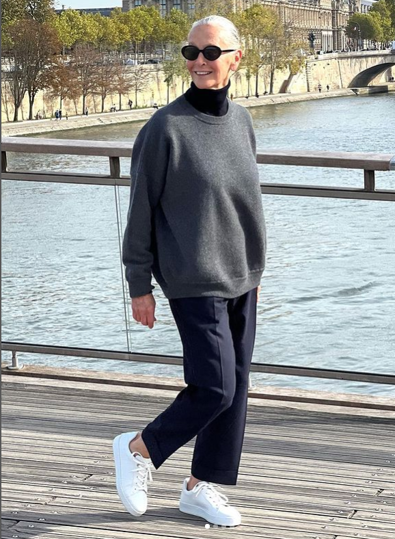 大家平时可以参考上图搭配,简简单单的灰色毛衣叠穿黑色高领衫,搭配藏蓝色烟管裤在脚踩小白鞋。色彩简约,没有多余配饰赋予整组搭配利落中性的调性,高级感满满,谁看了敢说奶奶有70+了呢?