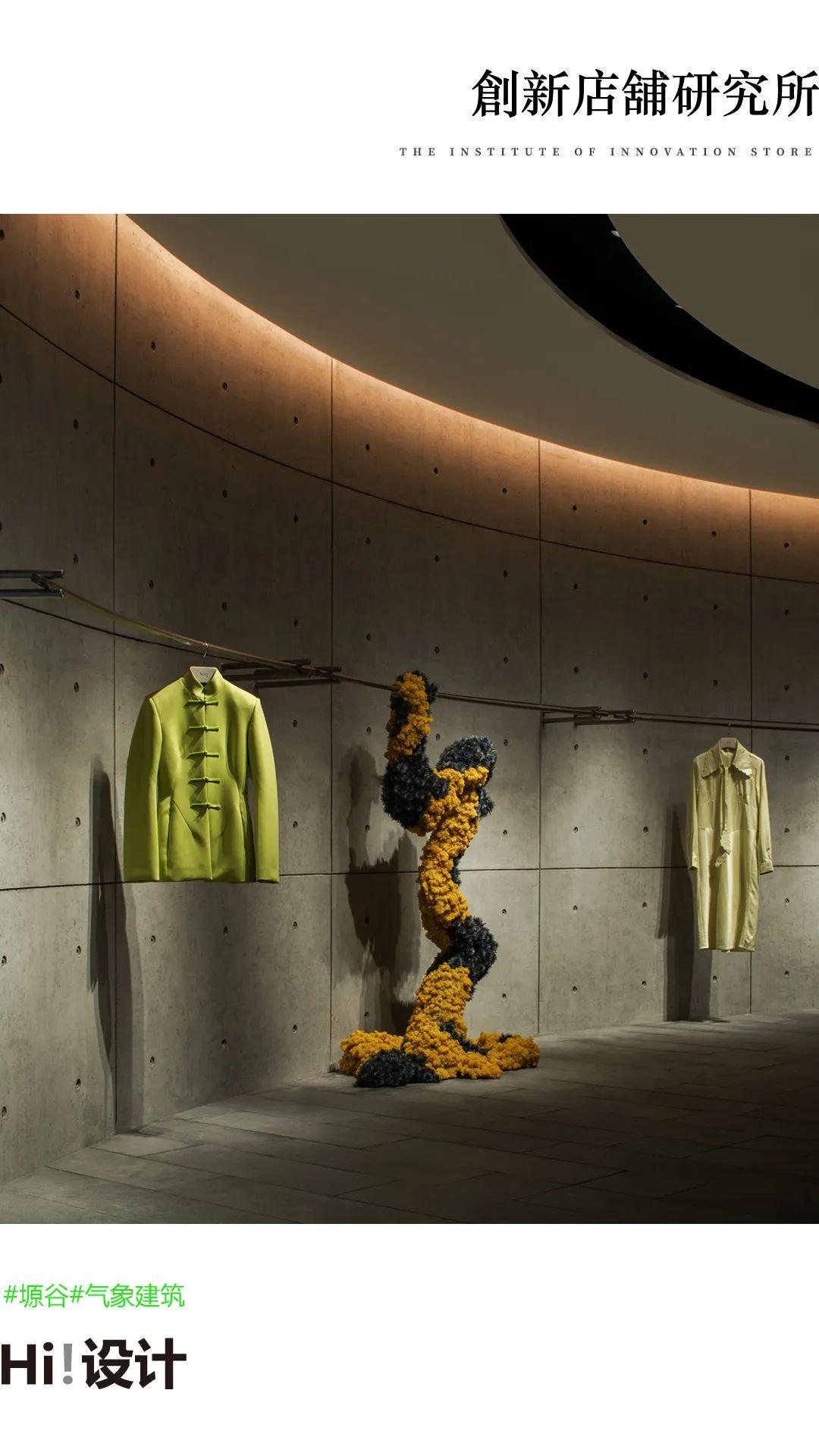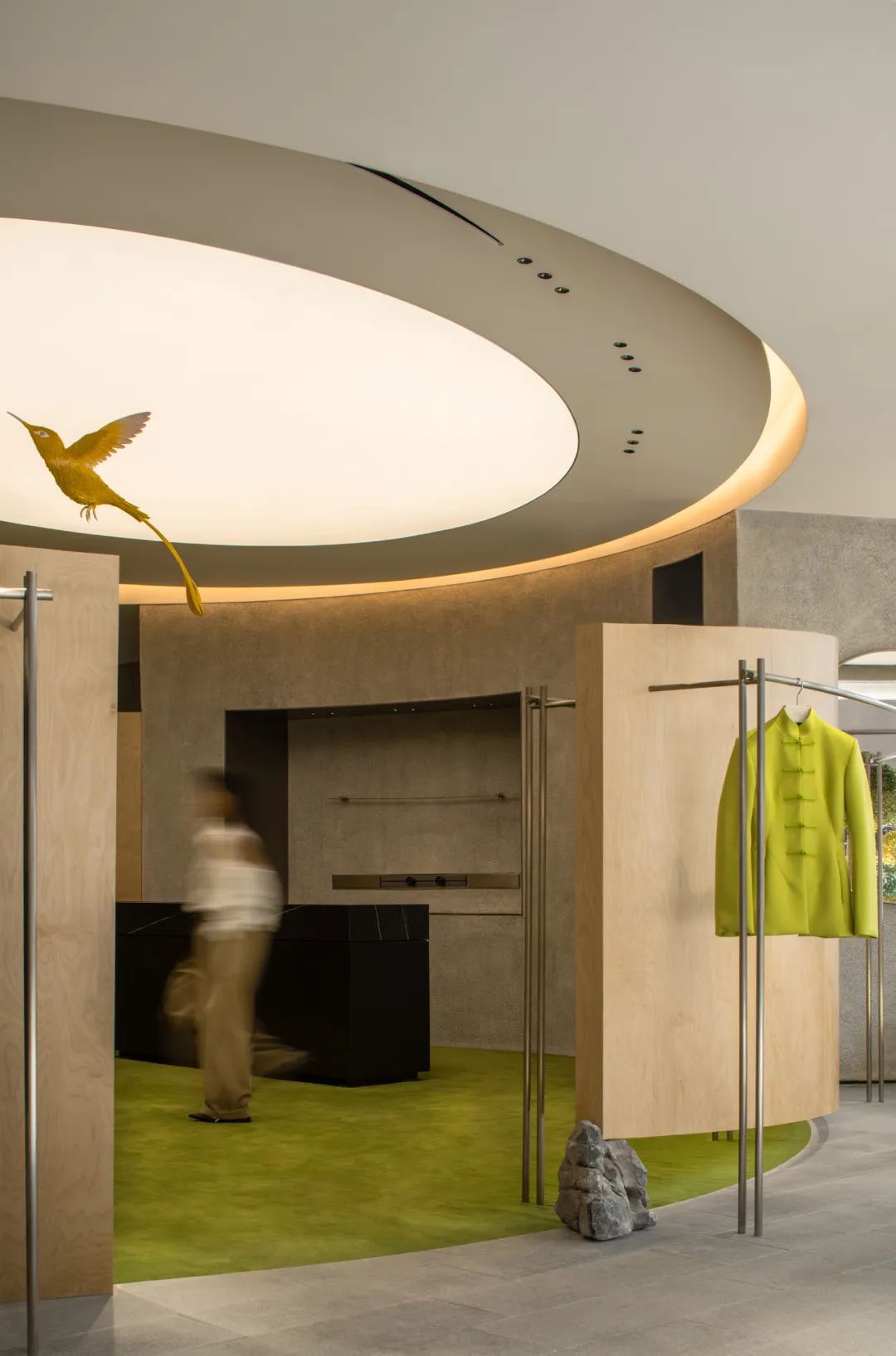 三维木质弧面拟山谷之态,坐落空间中心。四方围聚,山石做底,丰富空间层次的同时,亦塑造独有的精神堡垒。深入内里,可见顶部随性洒落的光线,配合运用大量线性与曲面线条演绎得星月环绕之象。而在此景之下,3D打印技术所模拟极速动势状态的蜂鸟亦振翅翱翔,绿色植绒地毯于底部大面积铺就,周边各色服饰环绕林立,一切元素在此奇妙而和谐的彼此相融,如同一方微型而充满生机的城市绿洲,予人亲和、蓬勃之感。设计在此试图以超现实想象贴合当代语境,予以自然新解,再造都市道场。