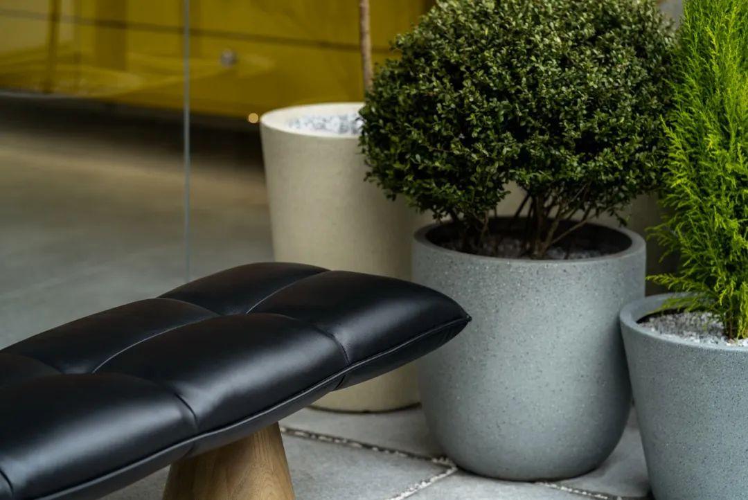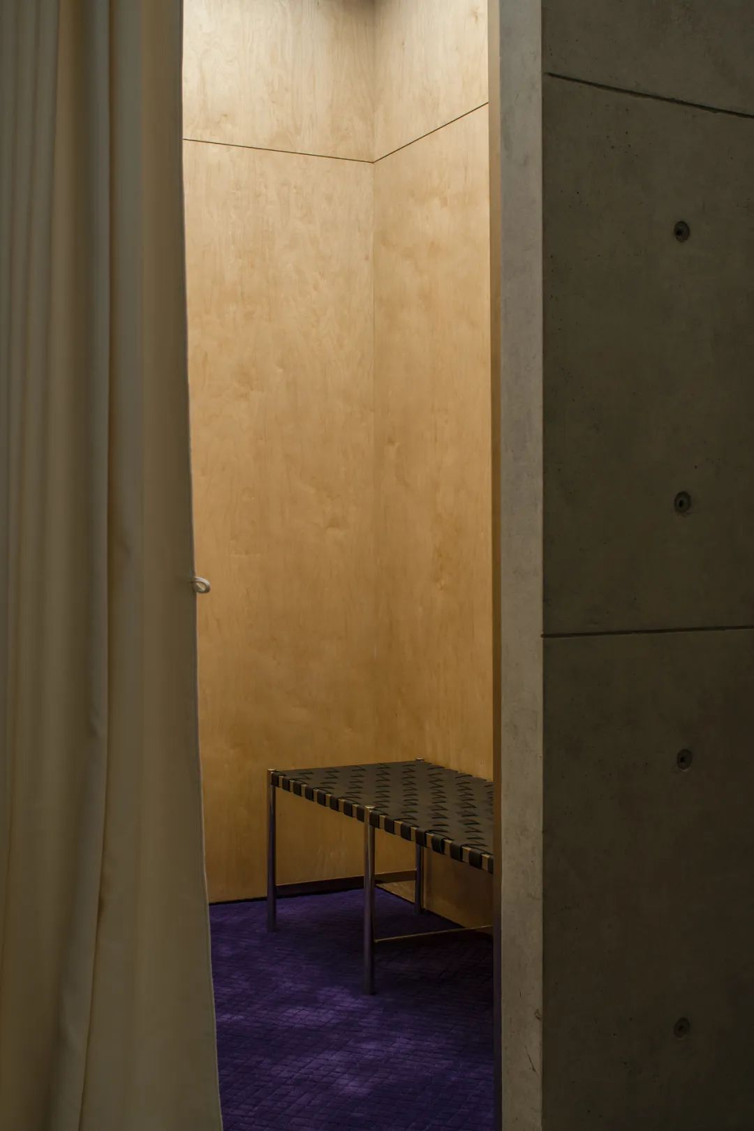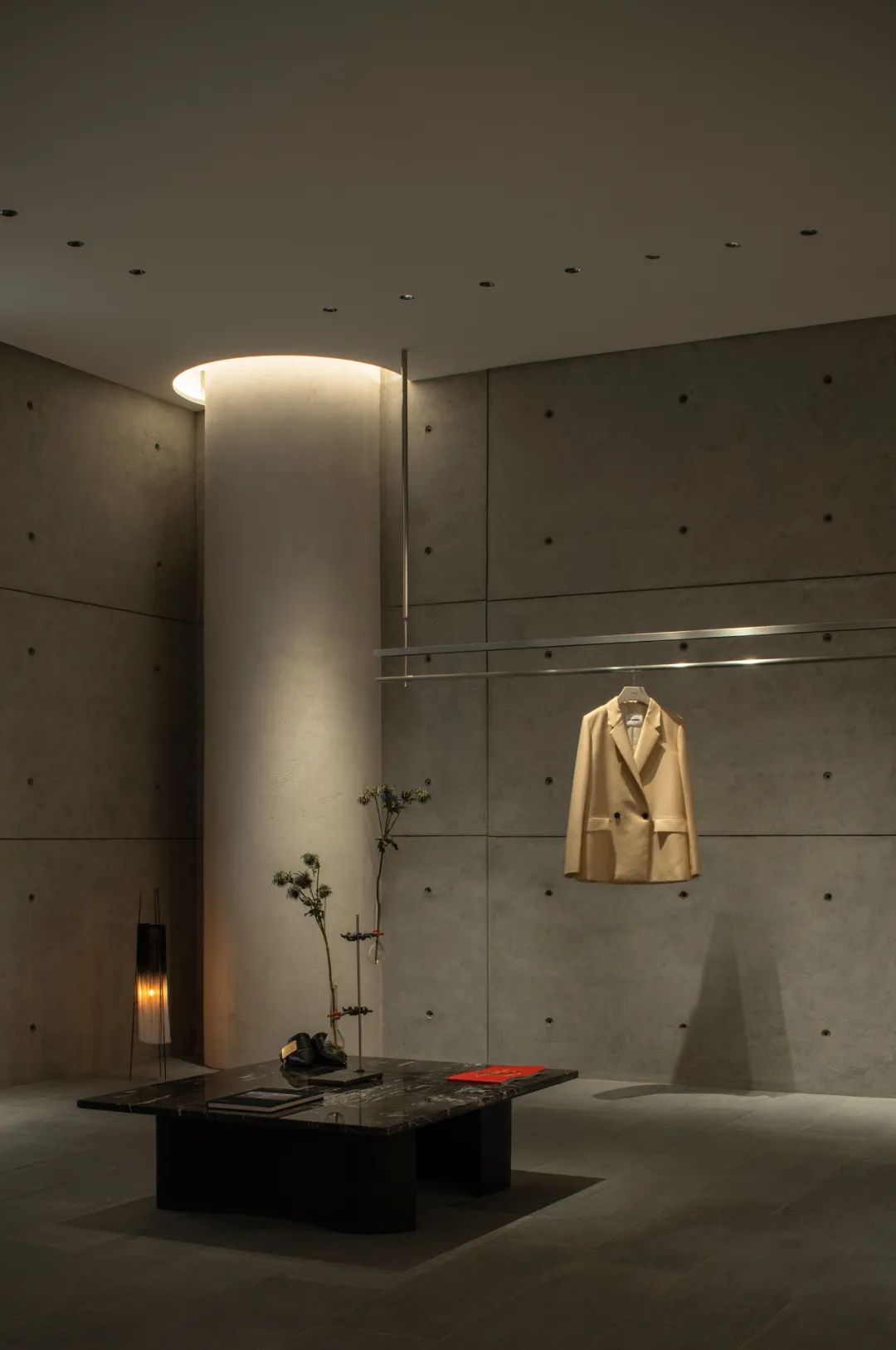 空间外立面由混凝土整体浇筑而成,回归原始本色,以光洁细腻的质感,实现内敛自持这一感官氛围的通感传递,跳脱出大环境既有的热闹喧嚣,以材质为引,实现主题灵感之于城市语境的过渡衔接,于城市核心区域辟出一隅,构筑素然之境。