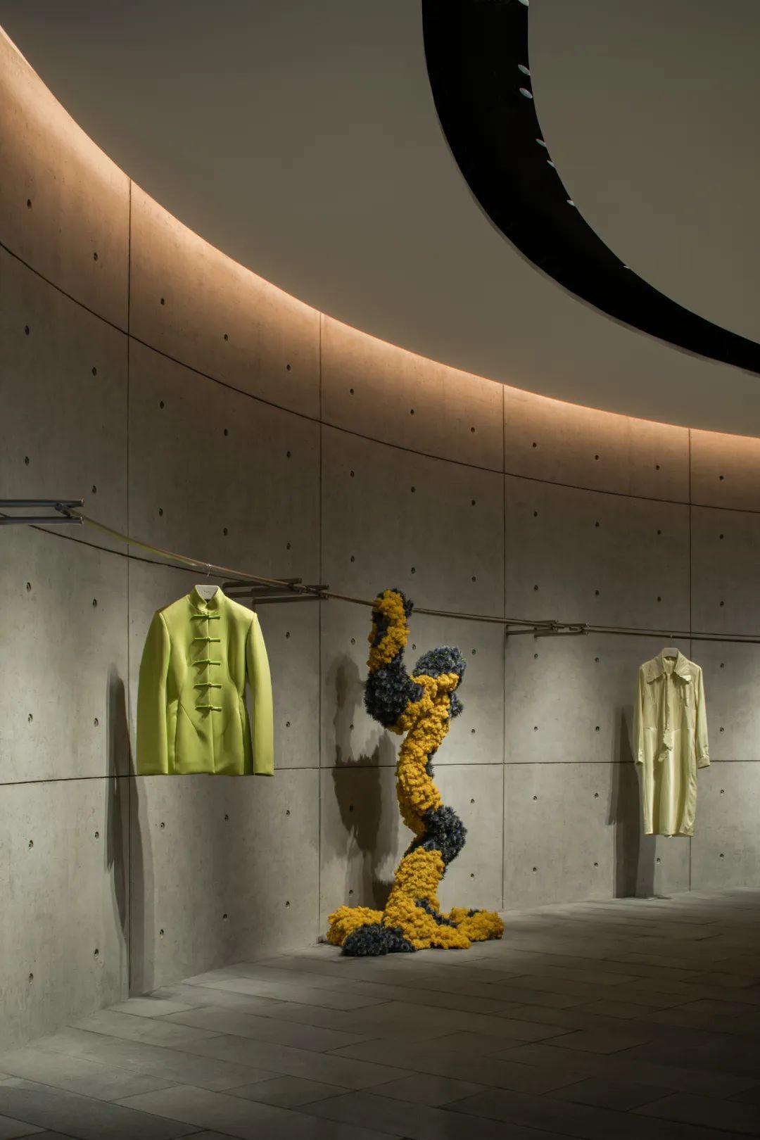 同时,就时尚买手店而言,服装、饰品及观者浏览动线的组合串联,无疑是整个空间功能性板块设计的核心。为贴合本次设计主题,完成自然氛围之下的崭新体验营造,在陈列秩序的设计与思考中,亦希望不同于常规一览无余的卖场式设置,而是基于品牌叙事维度,贴合当下新零售策展思维与沉浸观感,实现渐进式动线引导。在此规划之下,空间中的银色长杆成为视觉索引,承载空间主体展示与动线引导功能。容纳多元风格,带领进入者跟随指引,沿寻其里,探寻核心腹地。
