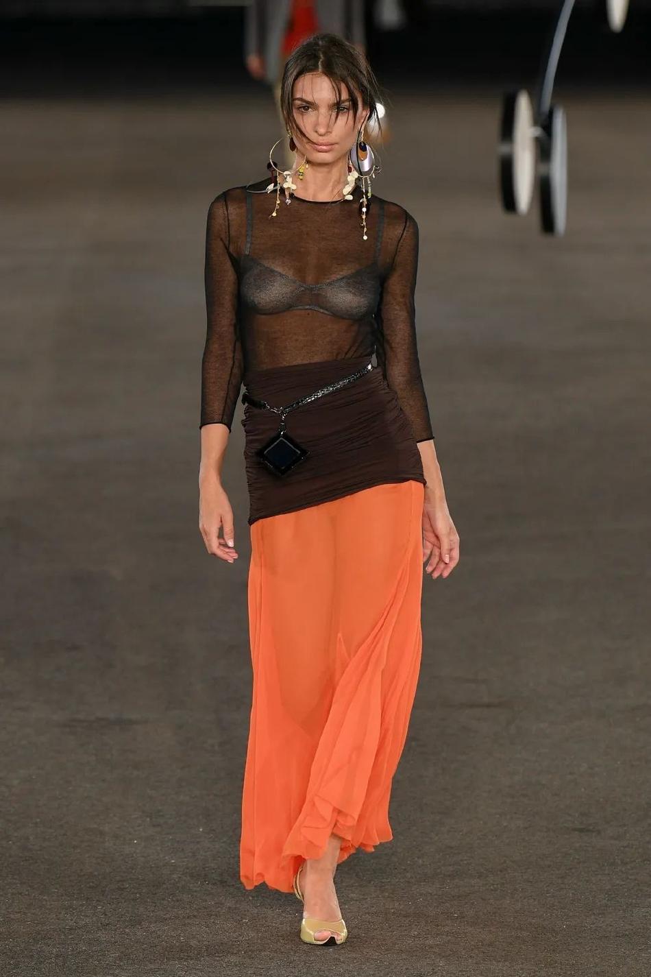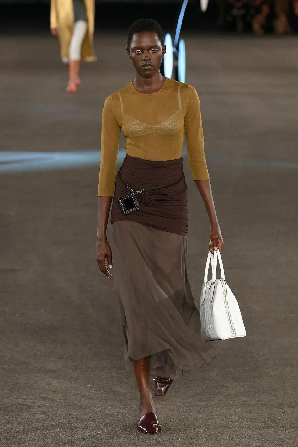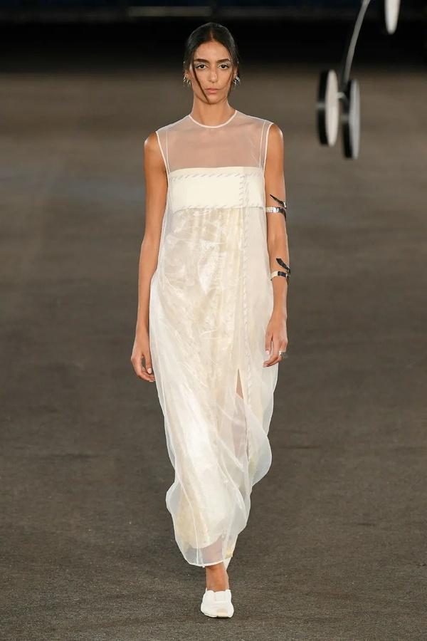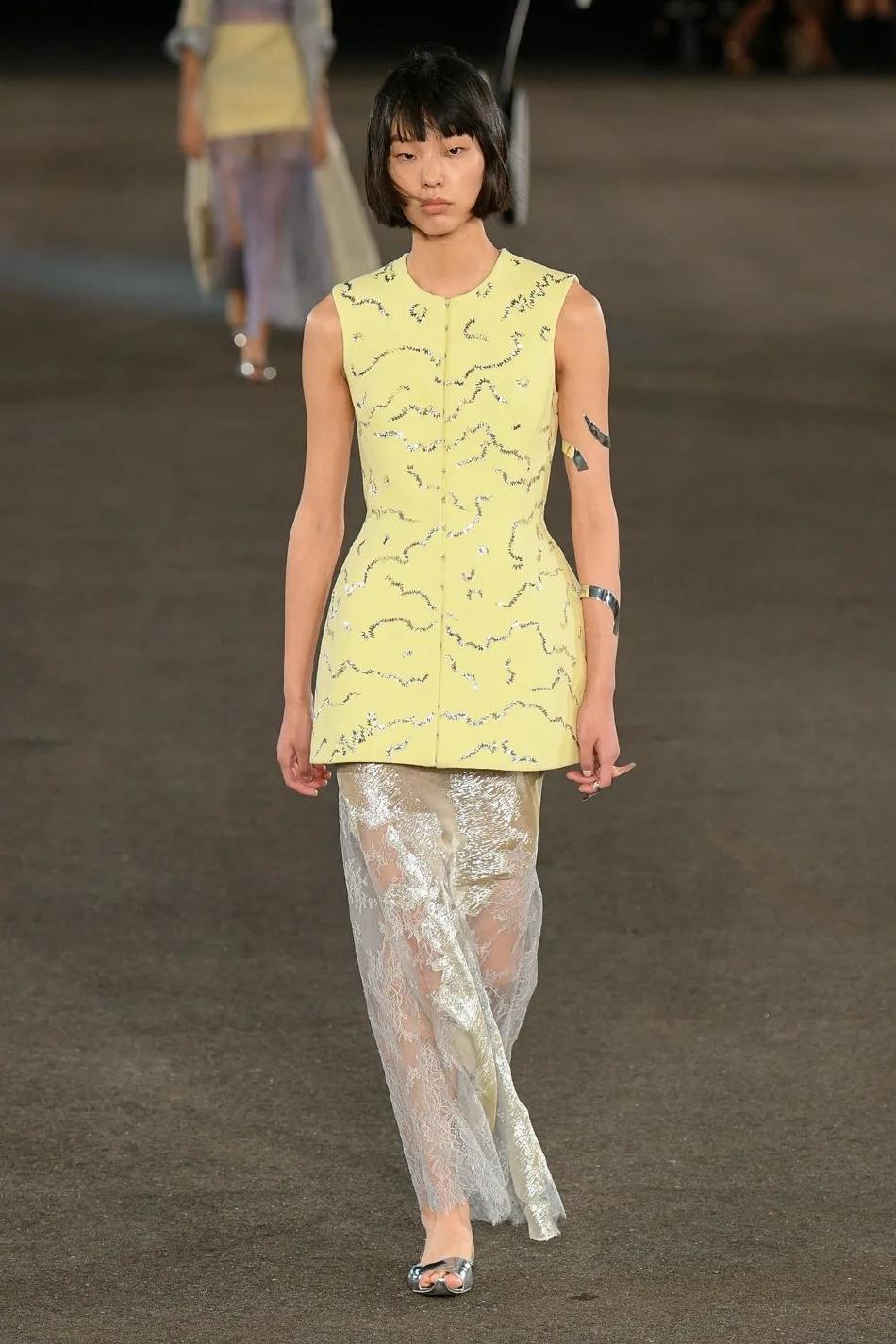 对轻盈的渴望在闪耀光泽的金银丝缎和蕾丝裙、通透的棉质针织衫和欧根纱罩衫中展露无遗,为晚装和迷你裙增添更为丰富的维度。