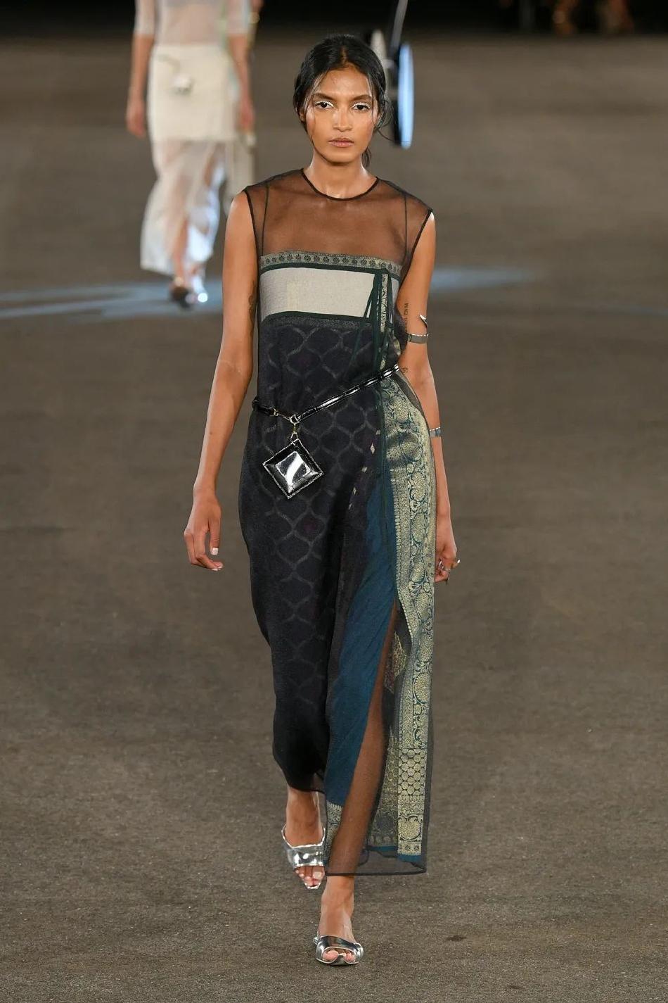 春夏系列以材质出发——透明与非透明、反光与哑光、奢华与质朴。精美的印度丝绸、意大利羊毛、金银丝缎、塔夫绸、蕾丝、和加扎尔丝绸,与之共存的是棉质T恤、牛仔和运动粘纤。面料成就廓形,其中的弹性令穿着更加舒适灵动。