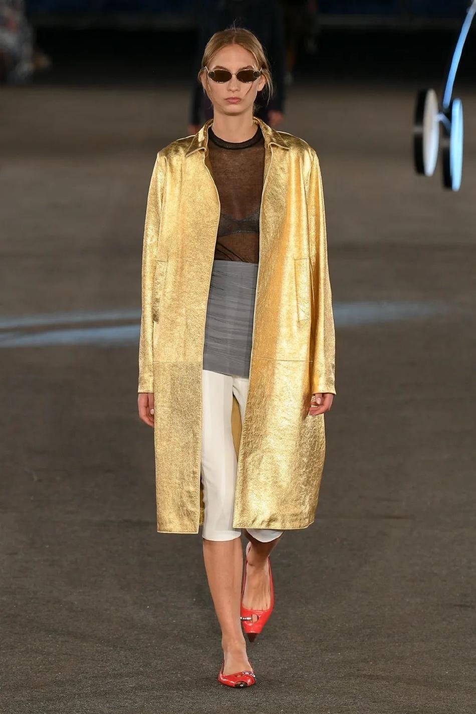 与之相对的是极具雕塑感的剪裁:模塑巴斯克束腰上衣、利落的意大利羊毛休闲西装,以及闪烁金箔色泽的皮制挺括大衣。