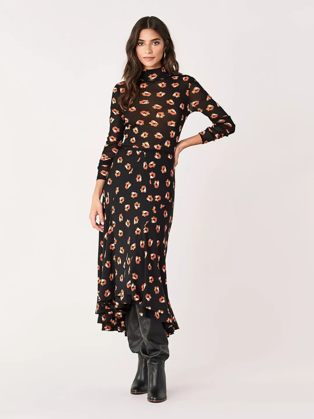 不对称垂坠半裙采用桑蚕丝面料制成,橙色波点花朵图案在这条半裙上徐徐绽放,不对称花边裙摆轻盈飘逸,让女性犹如偏偏起舞般灵动迷人。更多独特的设计和巧思期待着你来发现。