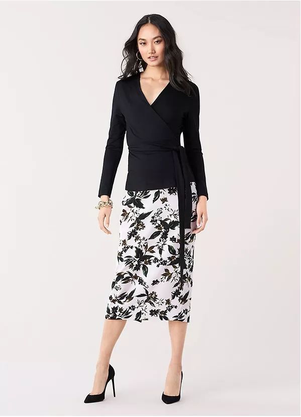 经典的裹身针织为整体造型增添一丝温暖气息,舒适透气,DVF标志性的裹身设计,收腰显瘦,凸显优雅气质。
