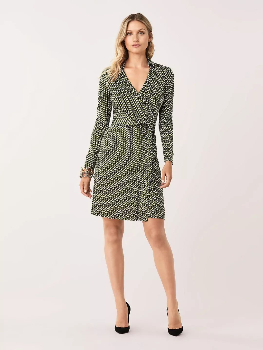 DVF经典翻领裹身裙,无纽扣,拉链,仅凭一条腰带勾勒出优雅身形;配以黑绿复古立体菱格纹图案,带来复古迷人味道。