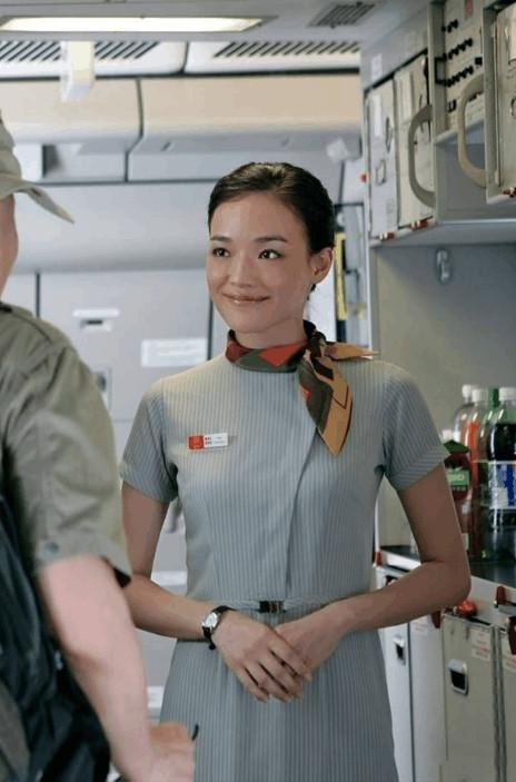 在《非诚勿扰2》中,与其他的空姐服装不同,这身制服相对朴素,竖条纹简单款搭配一条丝巾,但是舒淇身上,却有一种与众不同的优雅。