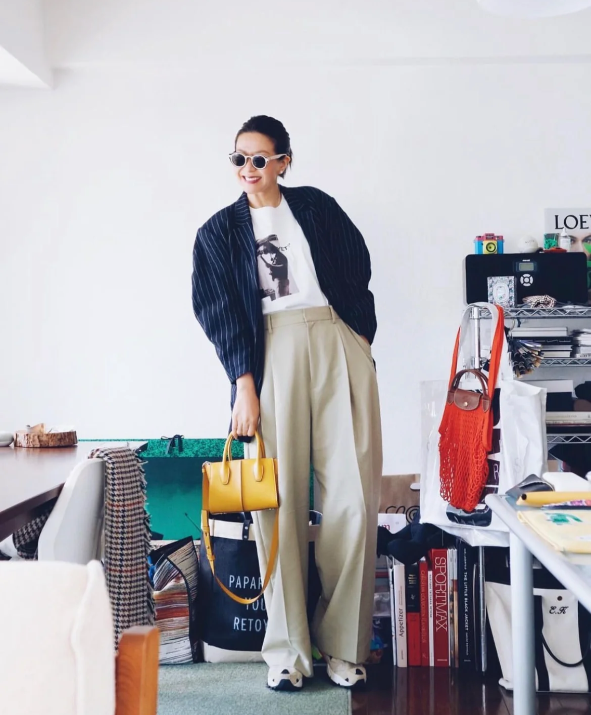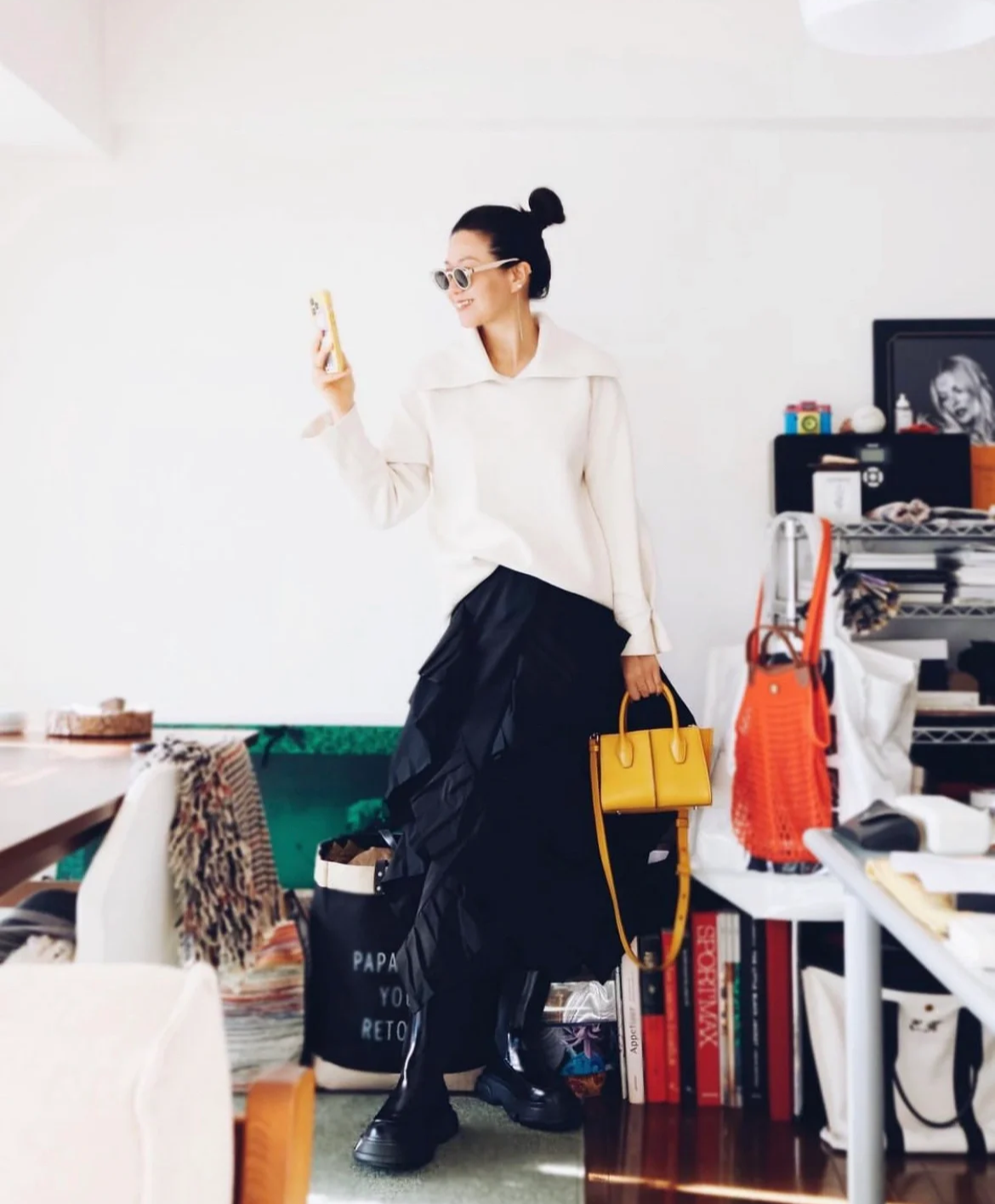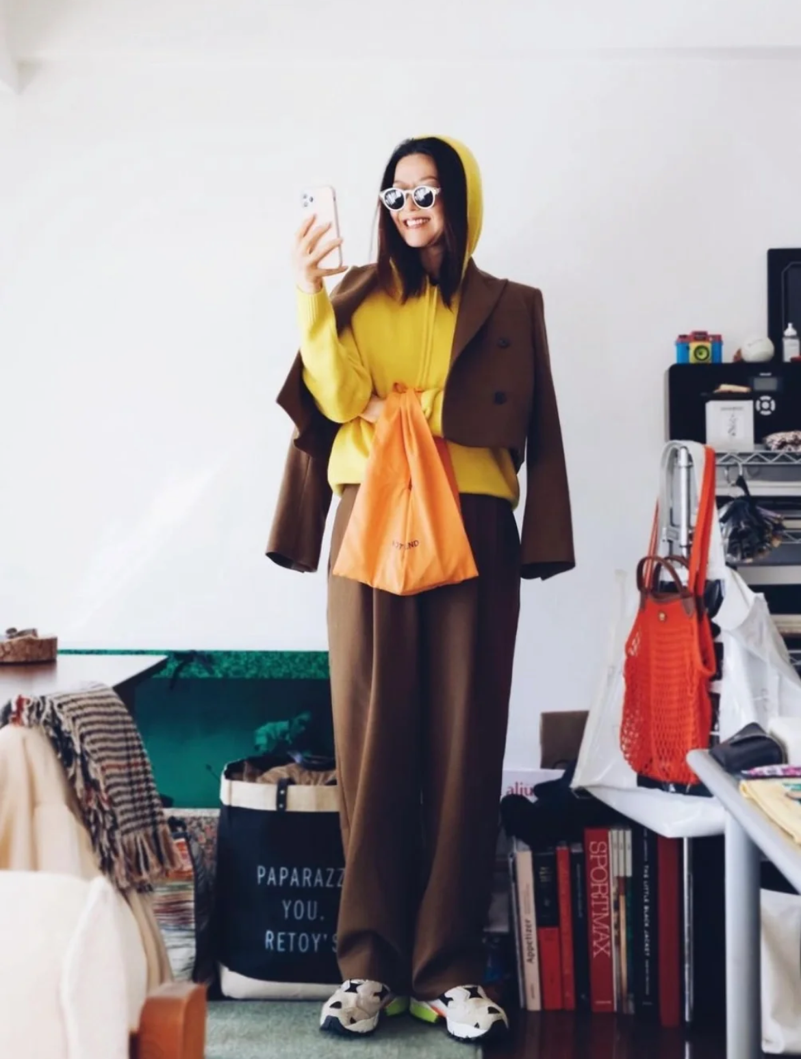 黄色的小包和高高的盘发几乎成为了北村惠奈风格的专属标志,它们的加入一改穿搭的普通,调和着生动与有趣。